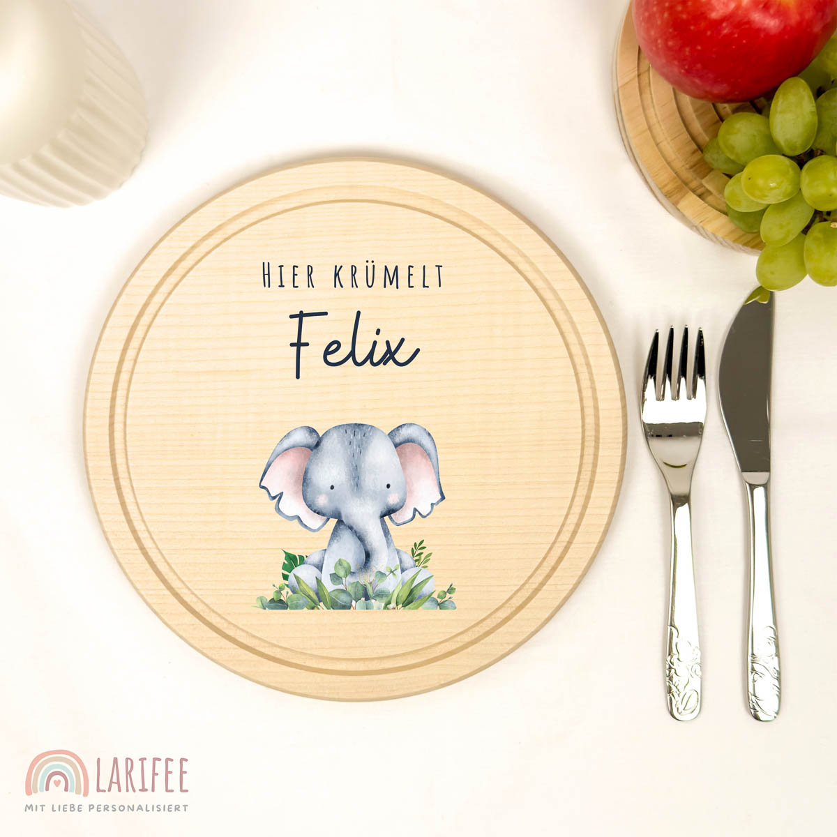 • Frühstücksbrettchen Holz rund personalisiert – Elefant