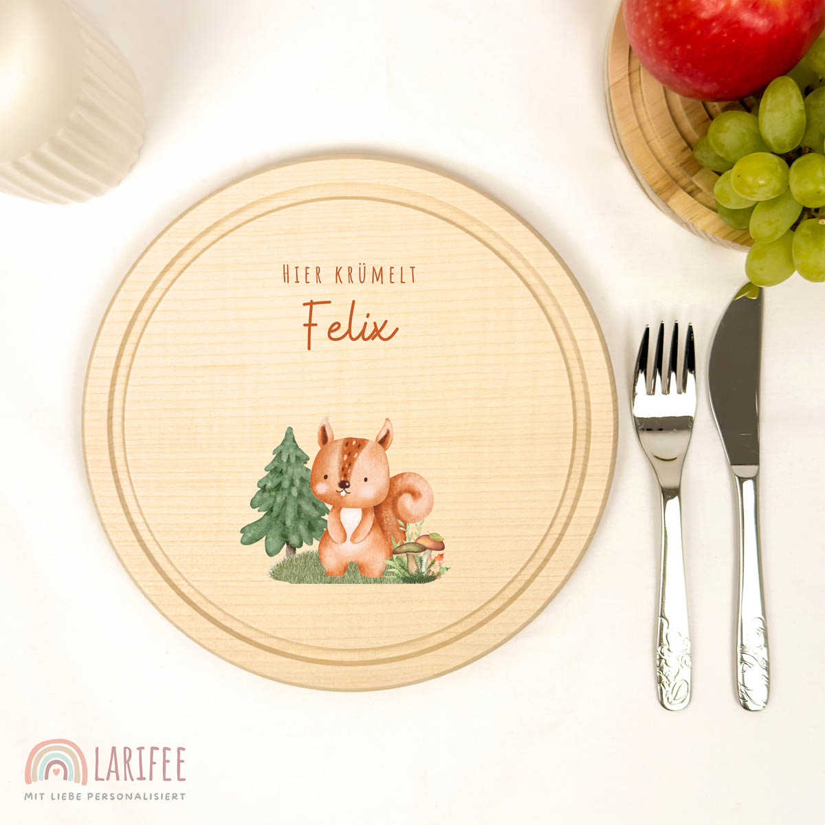 • Frühstücksbrettchen Holz rund personalisiert – Eichhörnchen