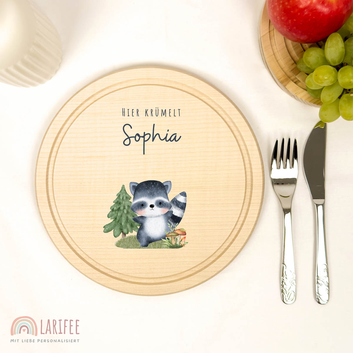 • Frühstücksbrettchen Holz rund personalisiert – Waschbär