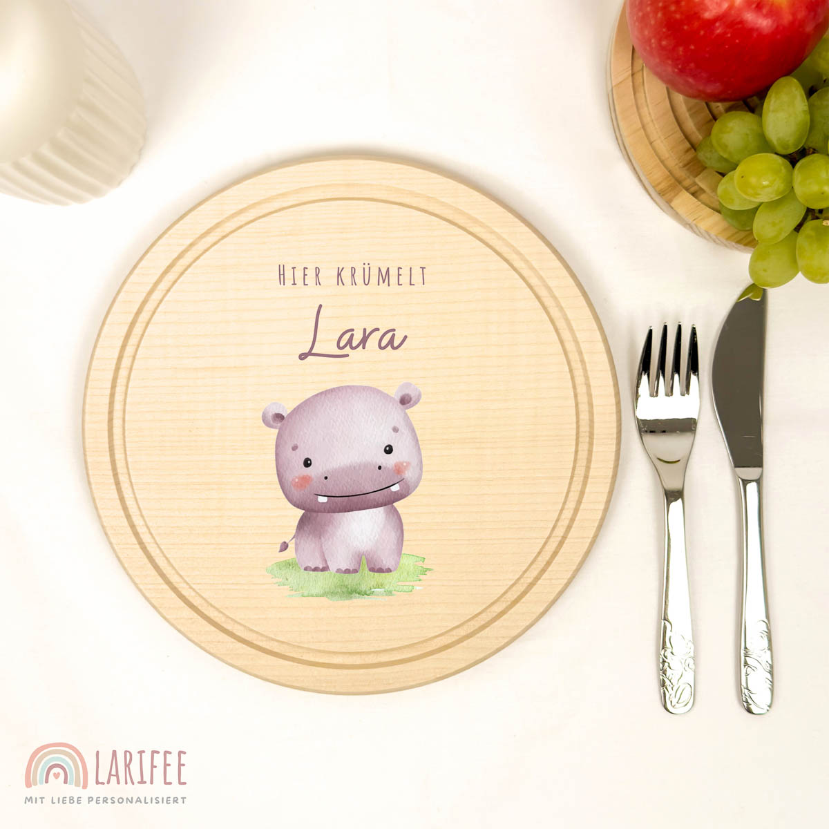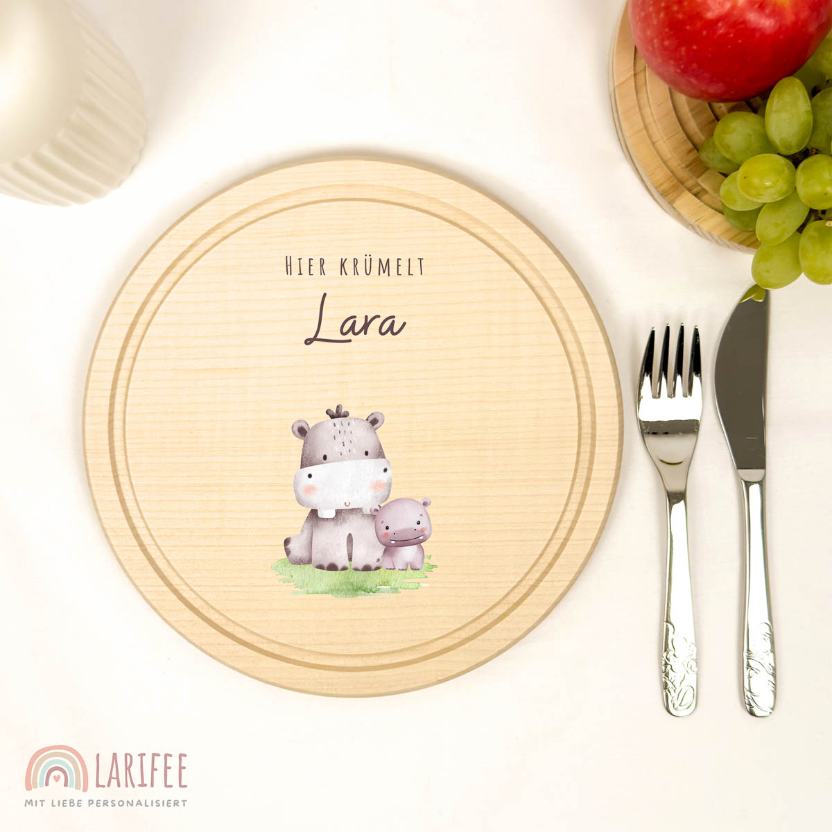 • Frühstücksbrettchen Holz rund personalisiert – Nilpferd
