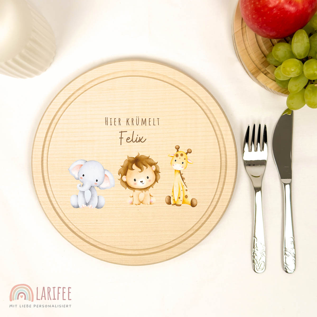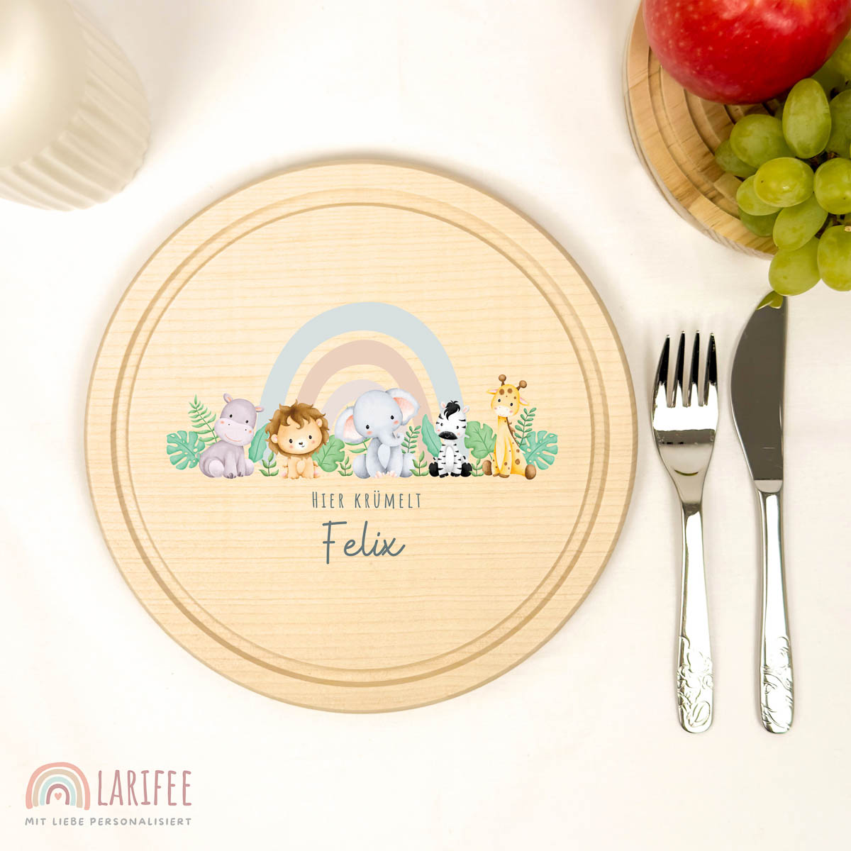 • Frühstücksbrettchen Holz rund personalisiert – Safari Tiere