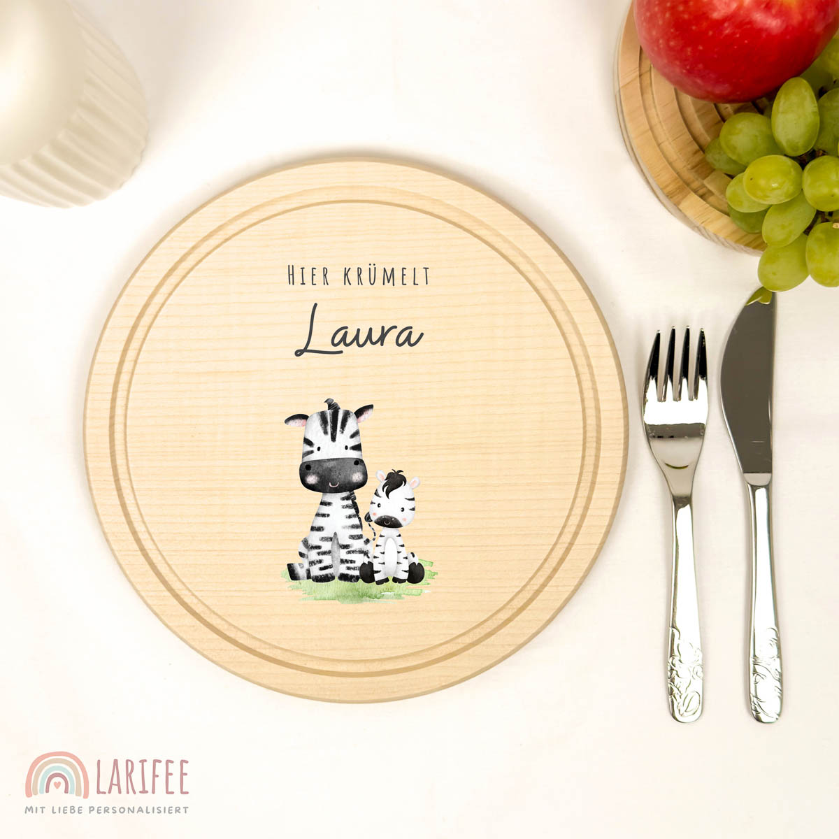 • Frühstücksbrettchen Holz rund personalisiert – Zebras