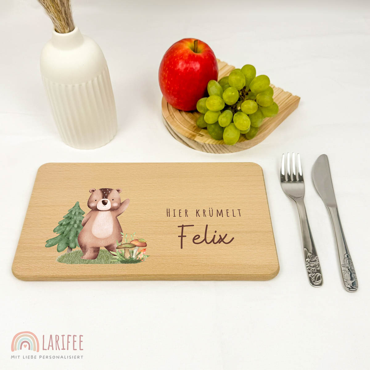 Unser personalisiertes Frühstücksbrettchen mit niedlichem Bären-Motiv macht jede Mahlzeit gemütlich.