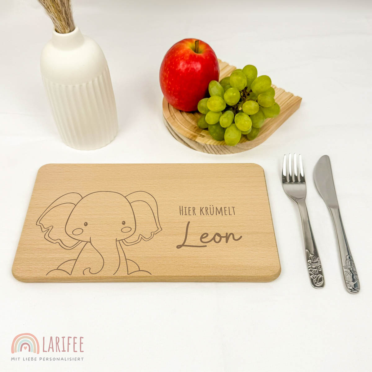 Unser personalisiertes Holzbrettchen mit starkem und sanftem Elefanten begleitet dein Kind durch den Tag.