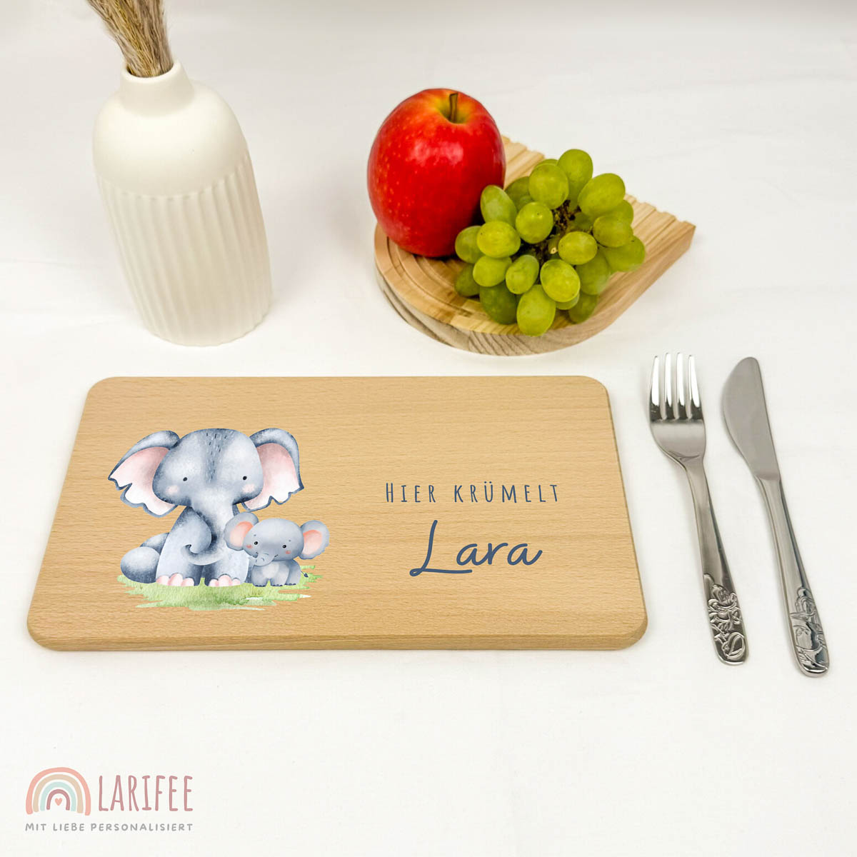 Unser personalisiertes Frühstücksbrettchen mit liebevollem Elefanten-Motiv bringt Freude an den Esstisch.