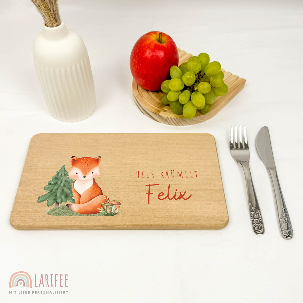 Unser personalisiertes Frühstücksbrettchen mit bezauberndem Fuchs-Motiv macht jede Mahlzeit besonders.