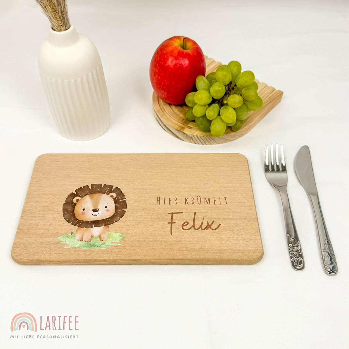 Das verspielte Löwen-Motiv verleiht jeder Mahlzeit eine wilde Note. Das personalisierte Frühstücksbrettchen aus hochwertigem Buchenholz ist mit umweltfreundlicher Tinte bedruckt, kratzfest und wasserfest. Perfekt für kleine Tierfreunde!