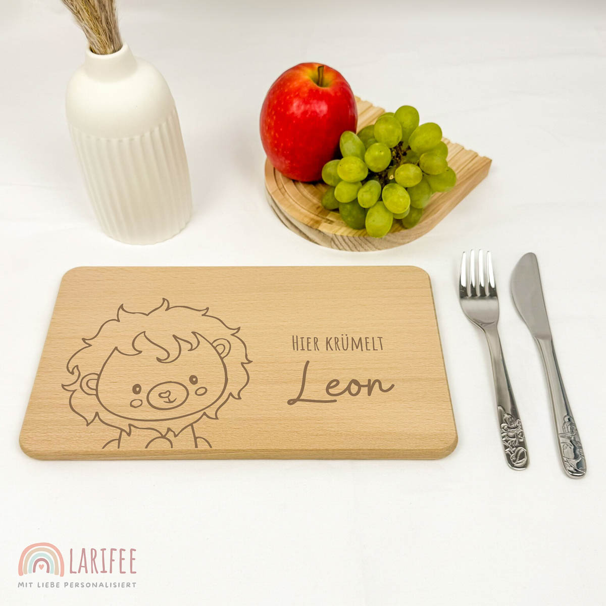 Ein mutiger Löwe wacht über jede Mahlzeit. Unser personalisiertes Brettchen aus hochwertigem Buchenholz, mit langlebiger Gravur, ist kratzfest, wasserfest und macht jede Pause besonders.