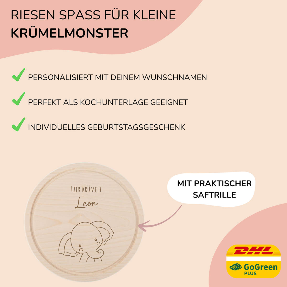 Der Elefant steht für Stärke und Ruhe – perfekt für kleine Genießer. Das runde Brettchen aus Ahornholz ist mit Laser graviert, kratzfest, wasserfest und mit Namen versehen.