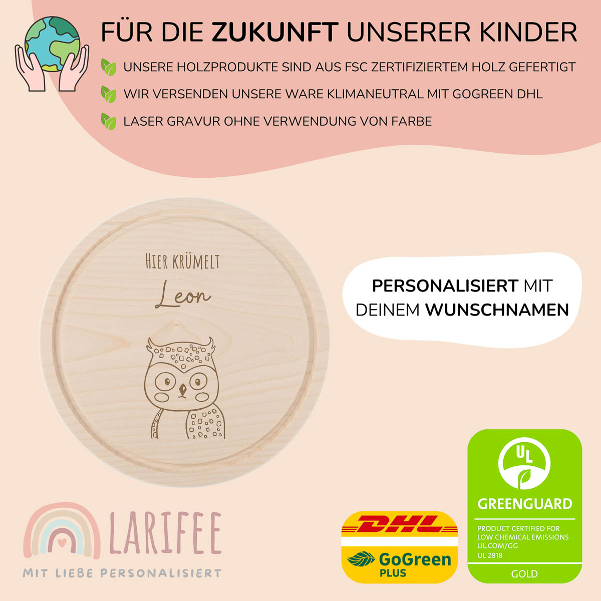 Wir setzen bei der Personalisierung auf hochwertige Lasergravur – ganz ohne Druck oder Folie. Die Tiermotive werden dauerhaft in das Holz eingebrannt und sind so besonders langlebig. Die Gravur ist spürbar, optisch ansprechend und frei von Schadstoffen – eine sichere Lösung für Kinderprodukte. Zudem ist sie kratzfest und wasserfest, ideal für den täglichen Gebrauch.