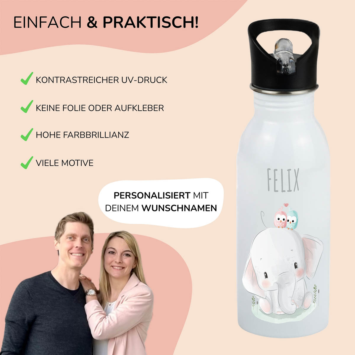 Ob zur Taufe, zum Kindergeburtstag oder zum Start in Kita oder Schule – oder einfach als kleine Freude zwischendurch: Diese Trinkflasche ist mehr als nur ein praktischer Begleiter. Sie begleitet dein Kind zuverlässig durch den Alltag – persönlich, durchdacht und mit viel Liebe gestaltet.