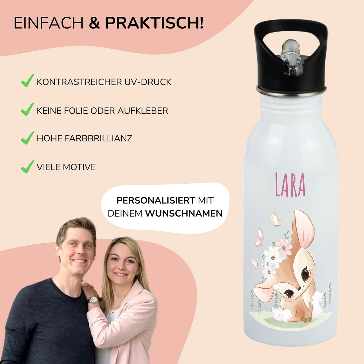 Trinkflasche Kinder personalisiert – Reh Kitz mit Blumen
