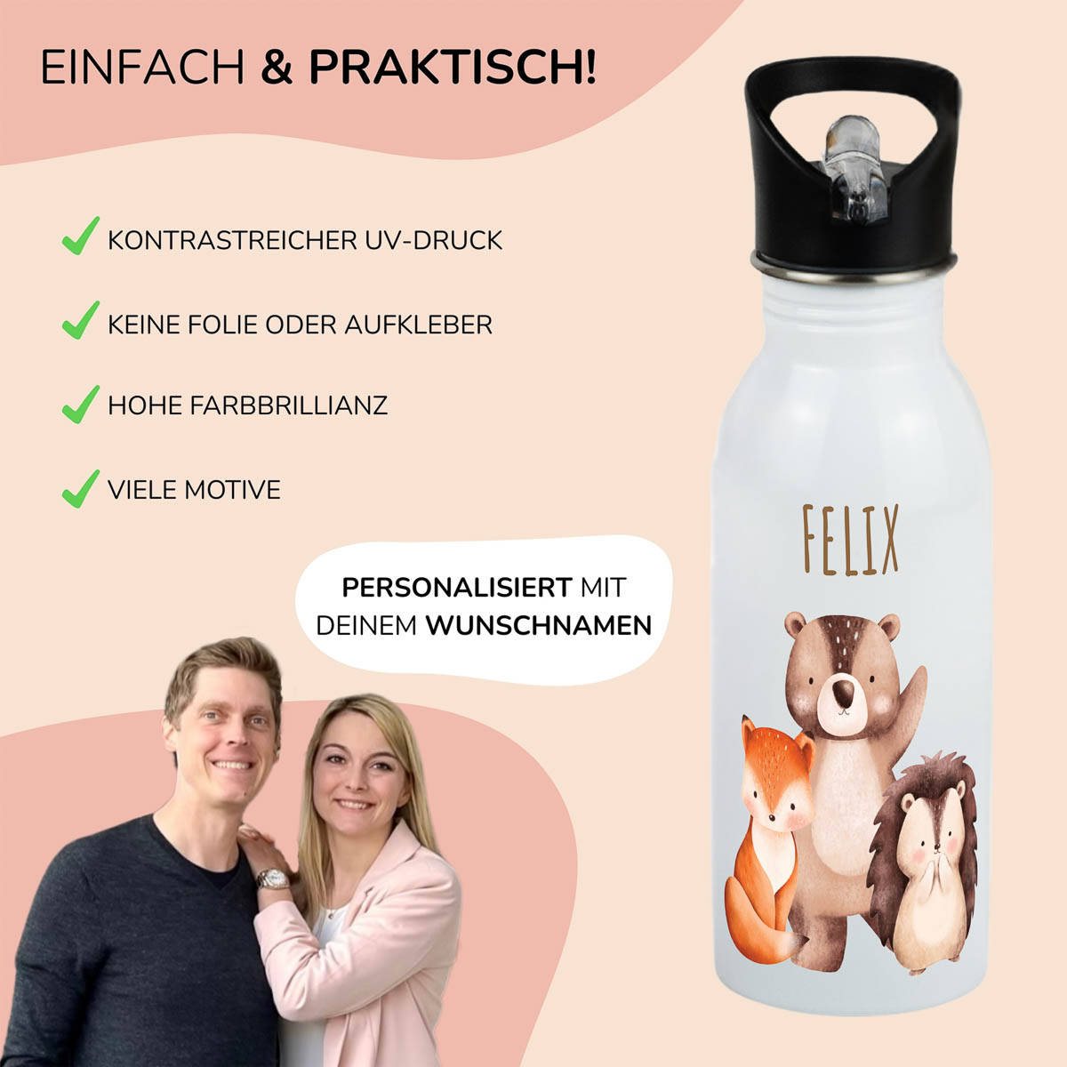 Trinkflasche, Wasserflasche personalisiert mit Namen und süßem Motiv – ein fröhlicher Alltagsbegleiter für kleine Entdecker
