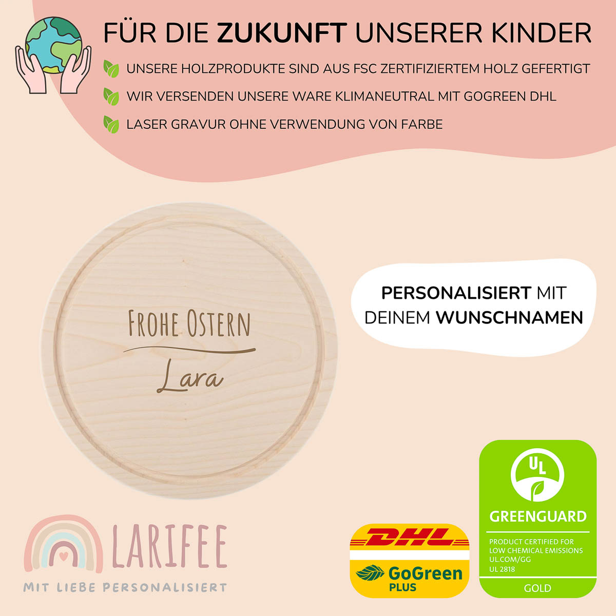 Frühstücksbrettchen Holz rund personalisiert – Frohe Ostern