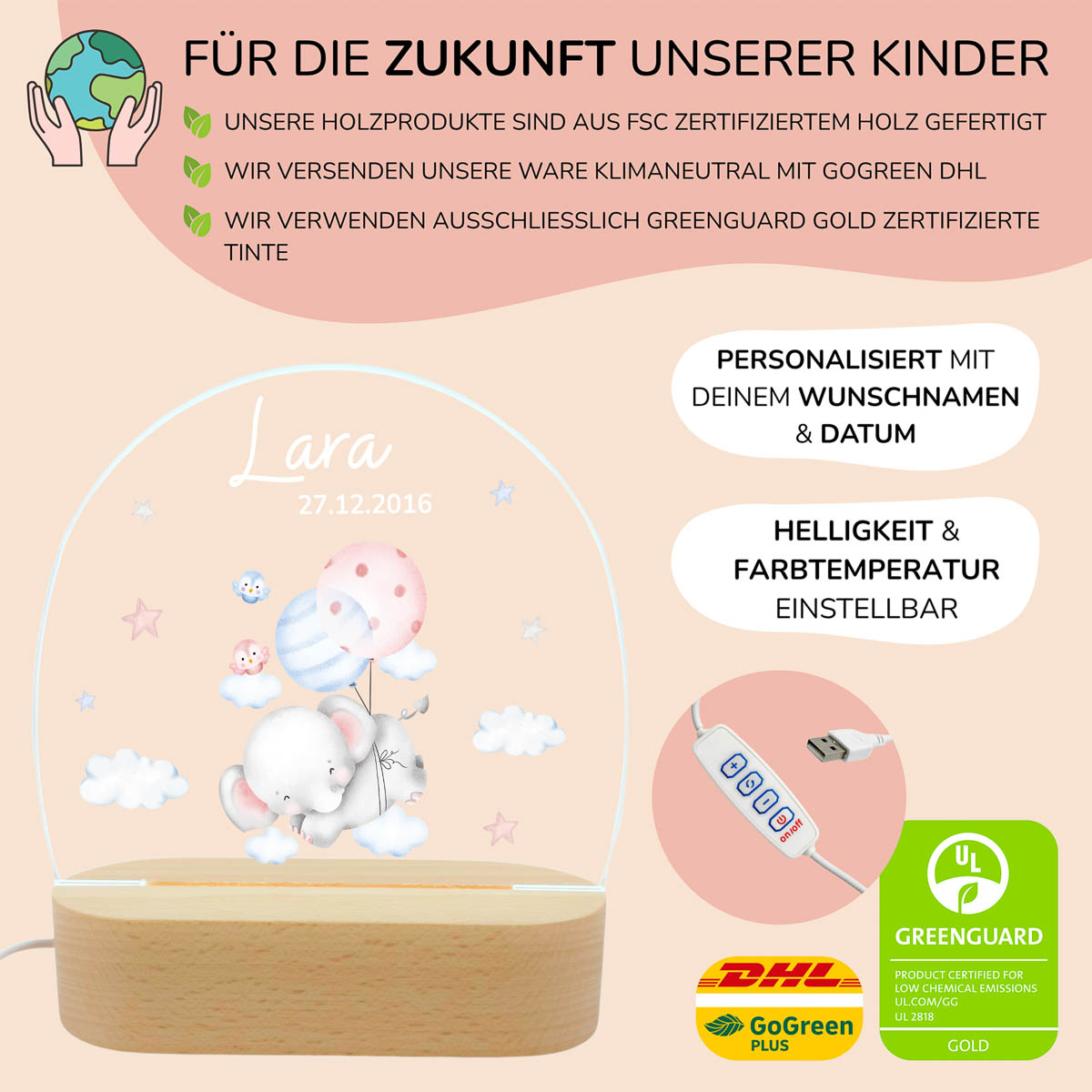 Nachtlicht Kinder & Baby personalisiert – Elefant Ballone
