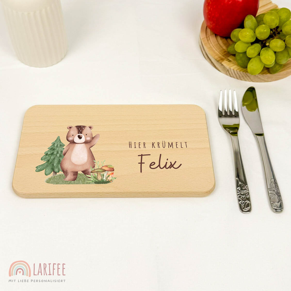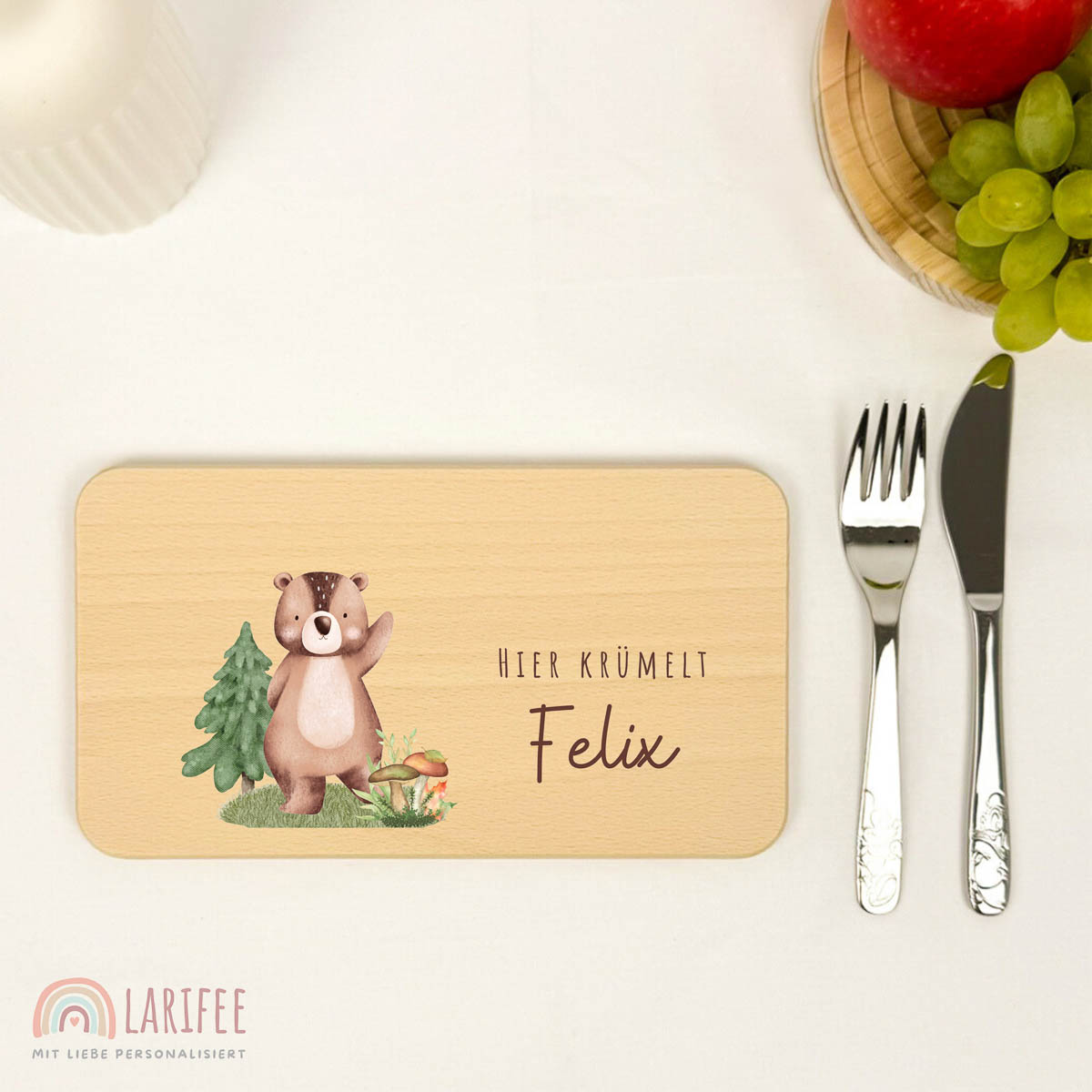Unser personalisiertes Frühstücksbrettchen mit niedlichem Bären-Motiv macht jede Mahlzeit gemütlich.