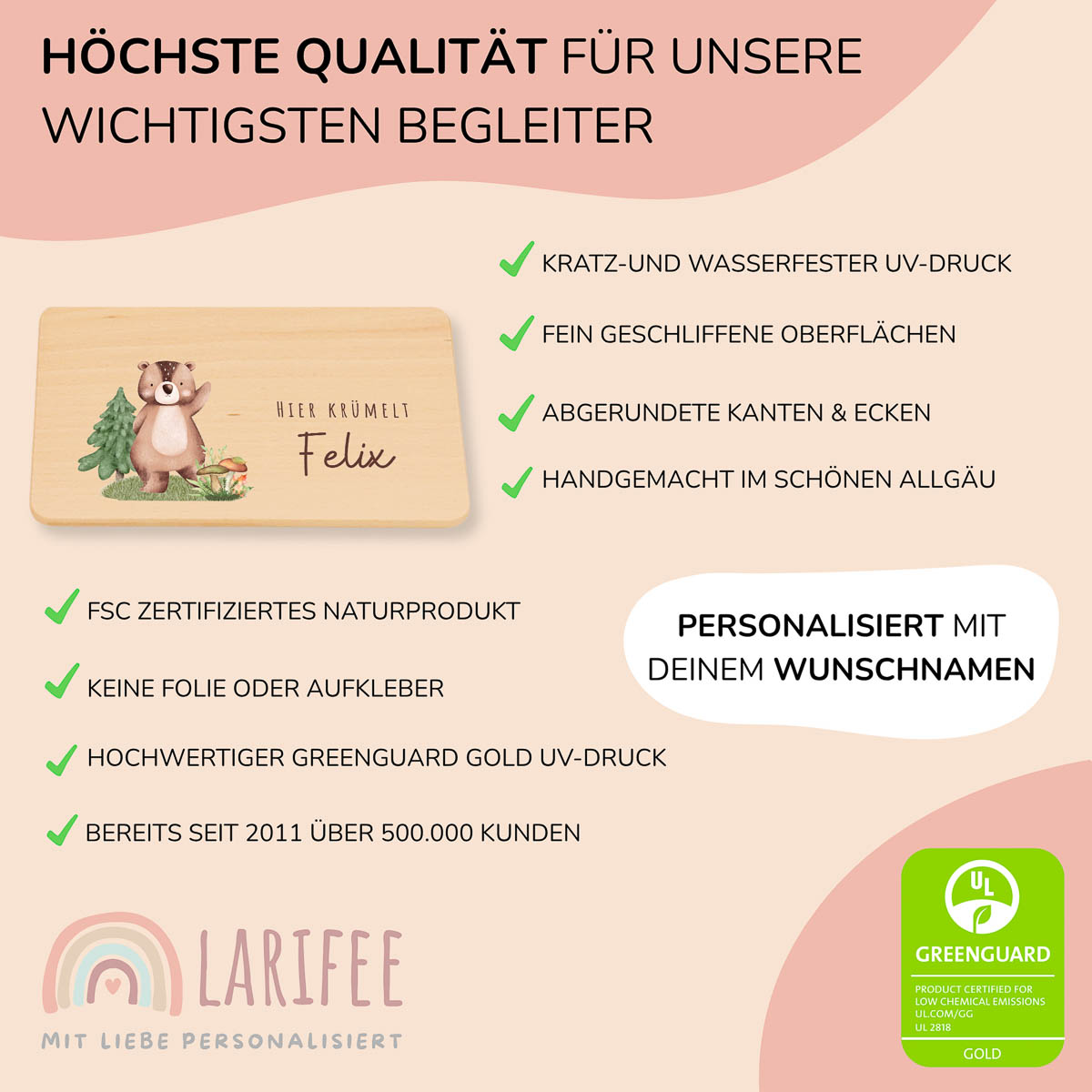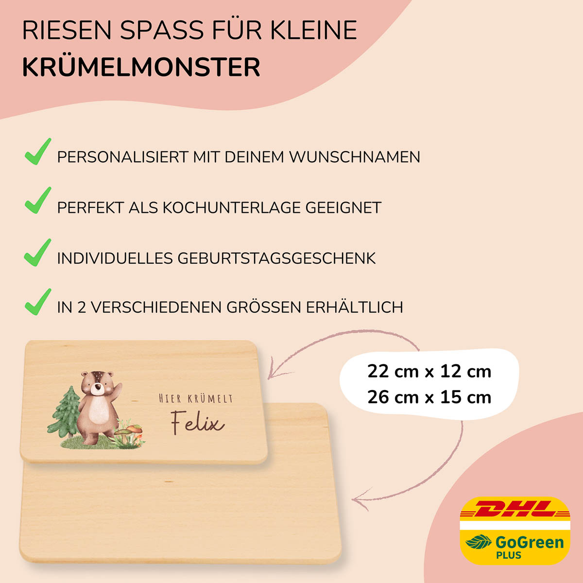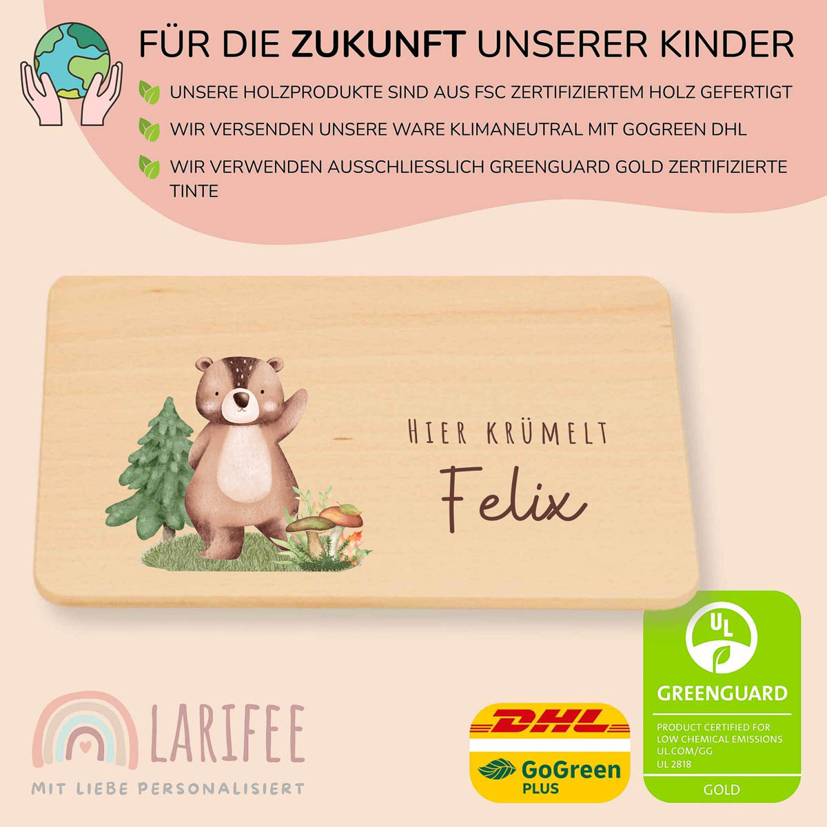Gefertigt aus hochwertigem Buchenholz, bedruckt mit umweltfreundlicher Tinte – kratzfest, wasserfest und ein praktischer Begleiter für kleine Genießer!