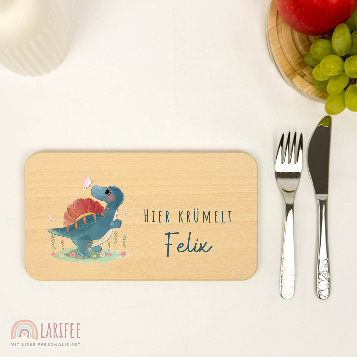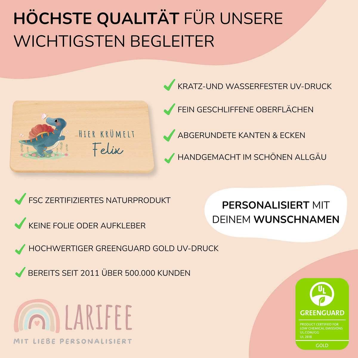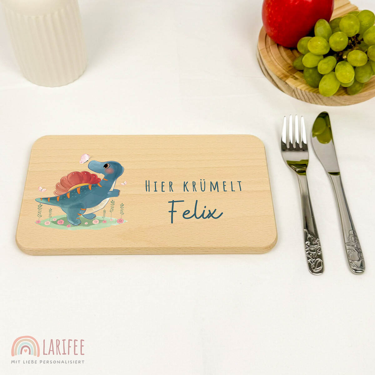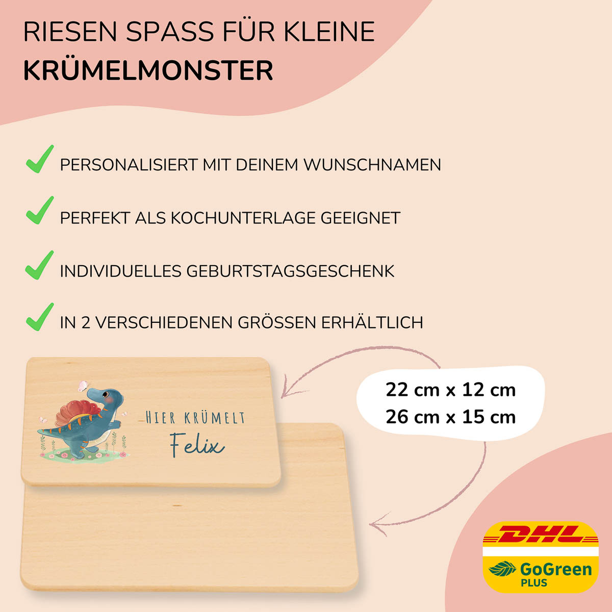 Mit diesem fröhlichen Dino wird das Essen nie langweilig! Das personalisierte Brettchen besteht aus hochwertigem Buchenholz, ist liebevoll gestaltet und hält richtig was aus. Bedruckt mit umweltfreundlicher Tinte, kratzfest und wasserfest – perfekt für kleine Dinofans mit großem Appetit!