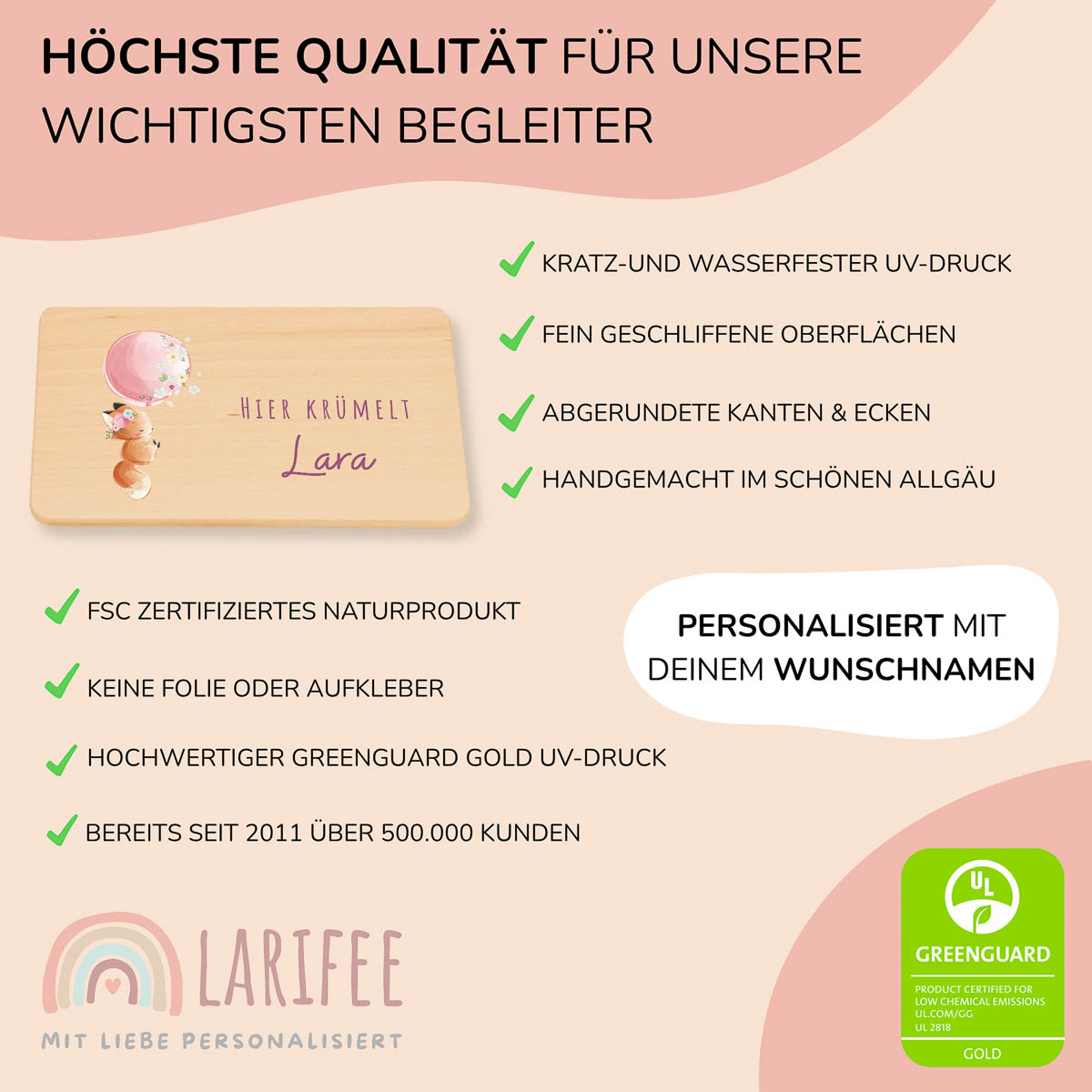Der kleine Fuchs mit Luftballon macht dein Brettchen zu einem fröhlichen Hingucker. Personalisiert mit deinem Namen, aus hochwertigem Buchenholz, bedruckt mit umweltfreundlicher Tinte, kratzfest und wasserfest – für bunte Brotzeitmomente!