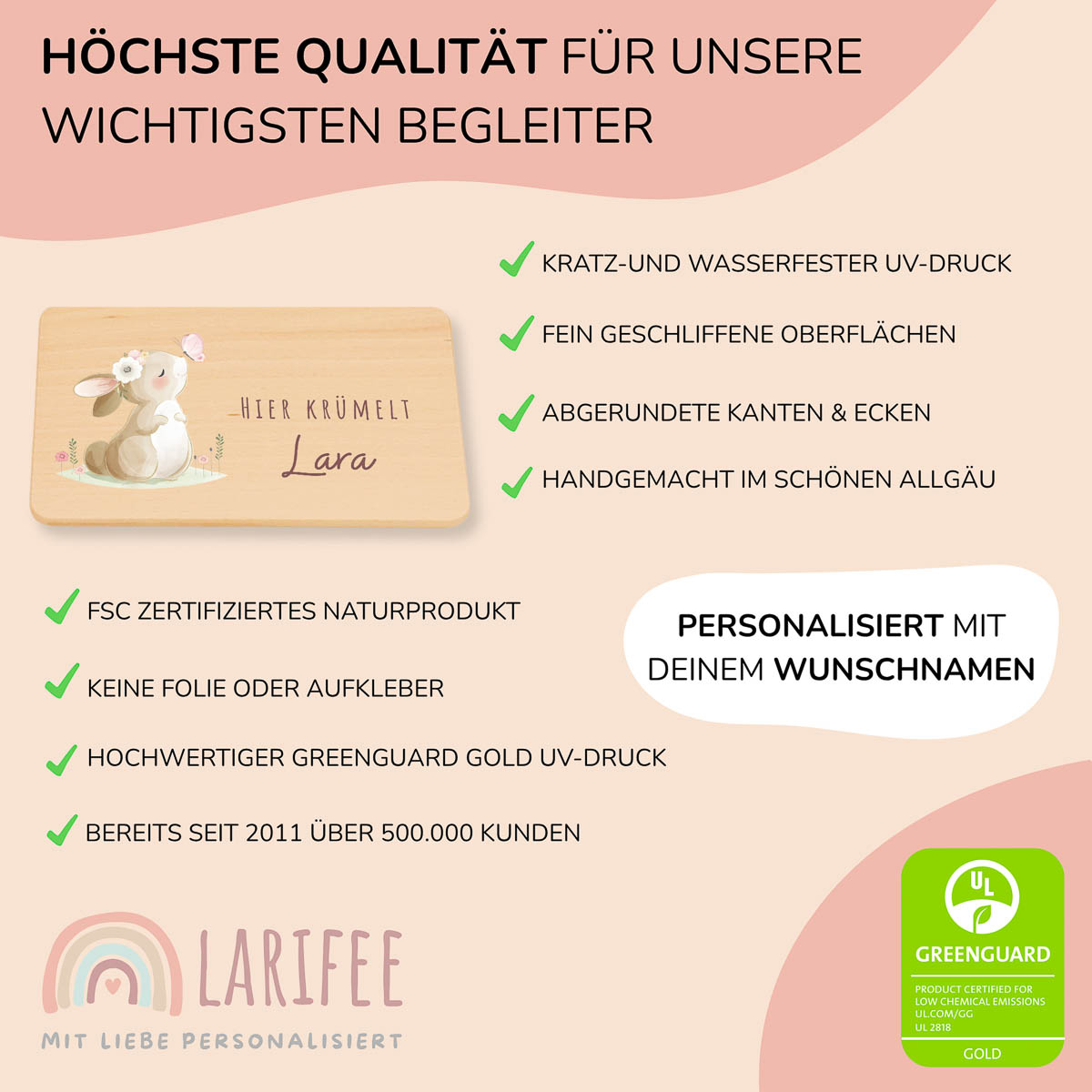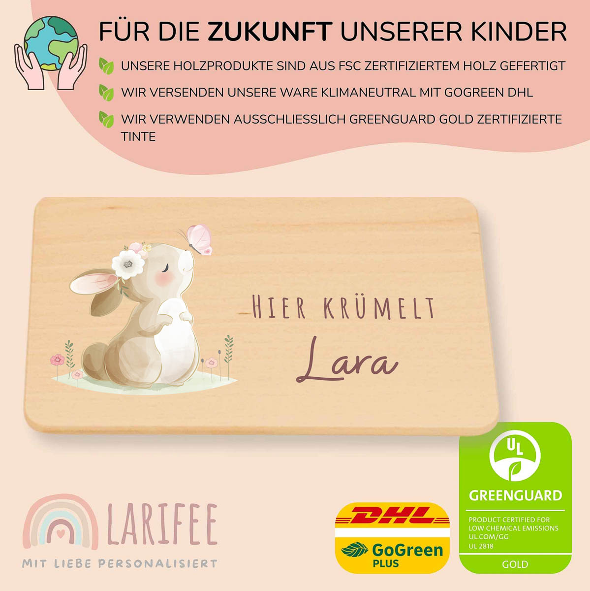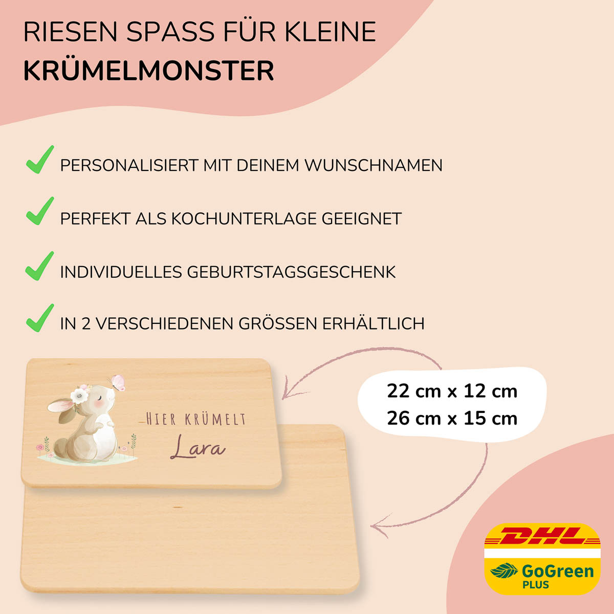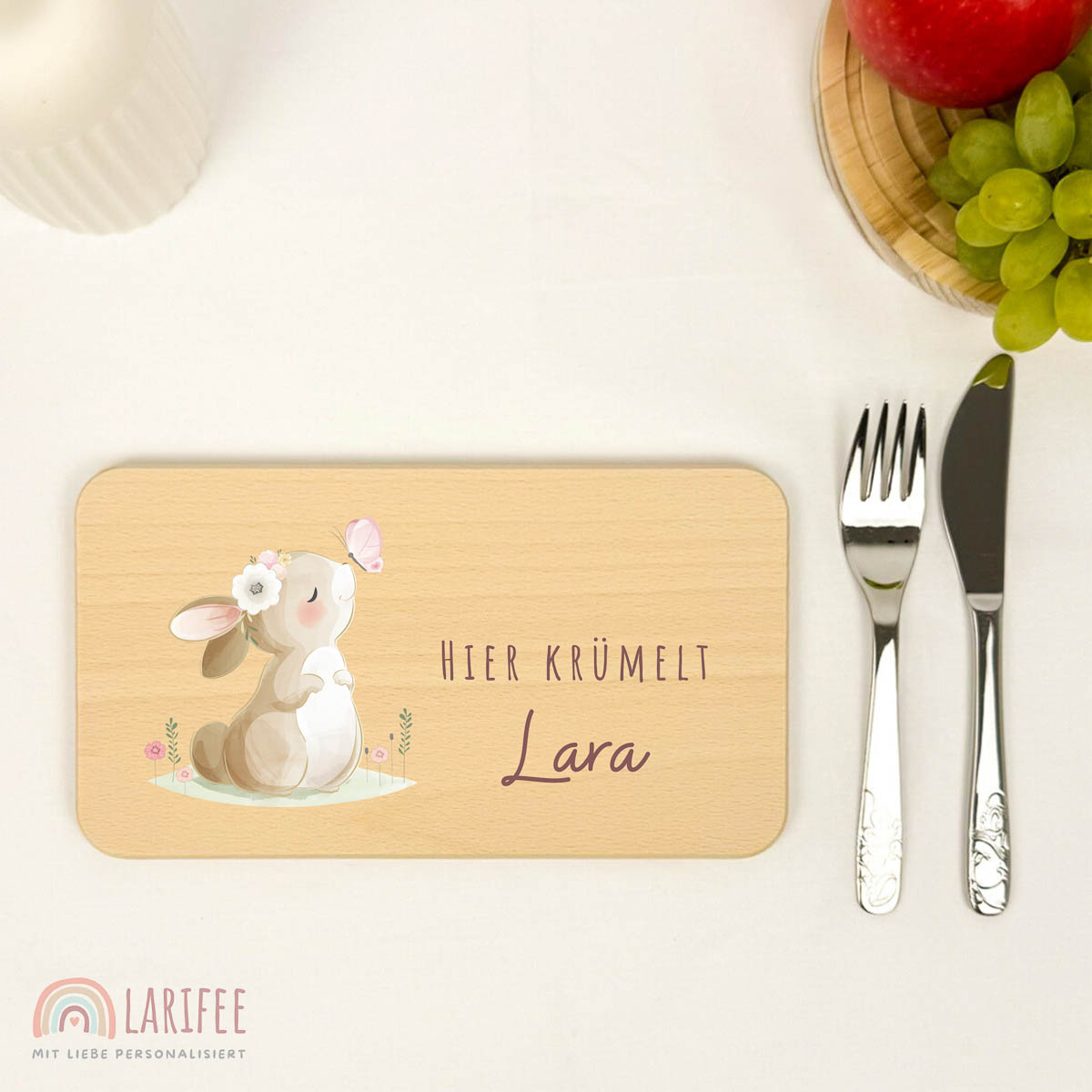Mit dem fröhlichen Häschen auf deinem personalisierten Brettchen wird jede Mahlzeit zum Lieblingsmoment. Hochwertiges Buchenholz, bedruckt mit umweltfreundlicher Tinte, kratzfest und wasserfest – perfekt für kleine Genießerinnen!