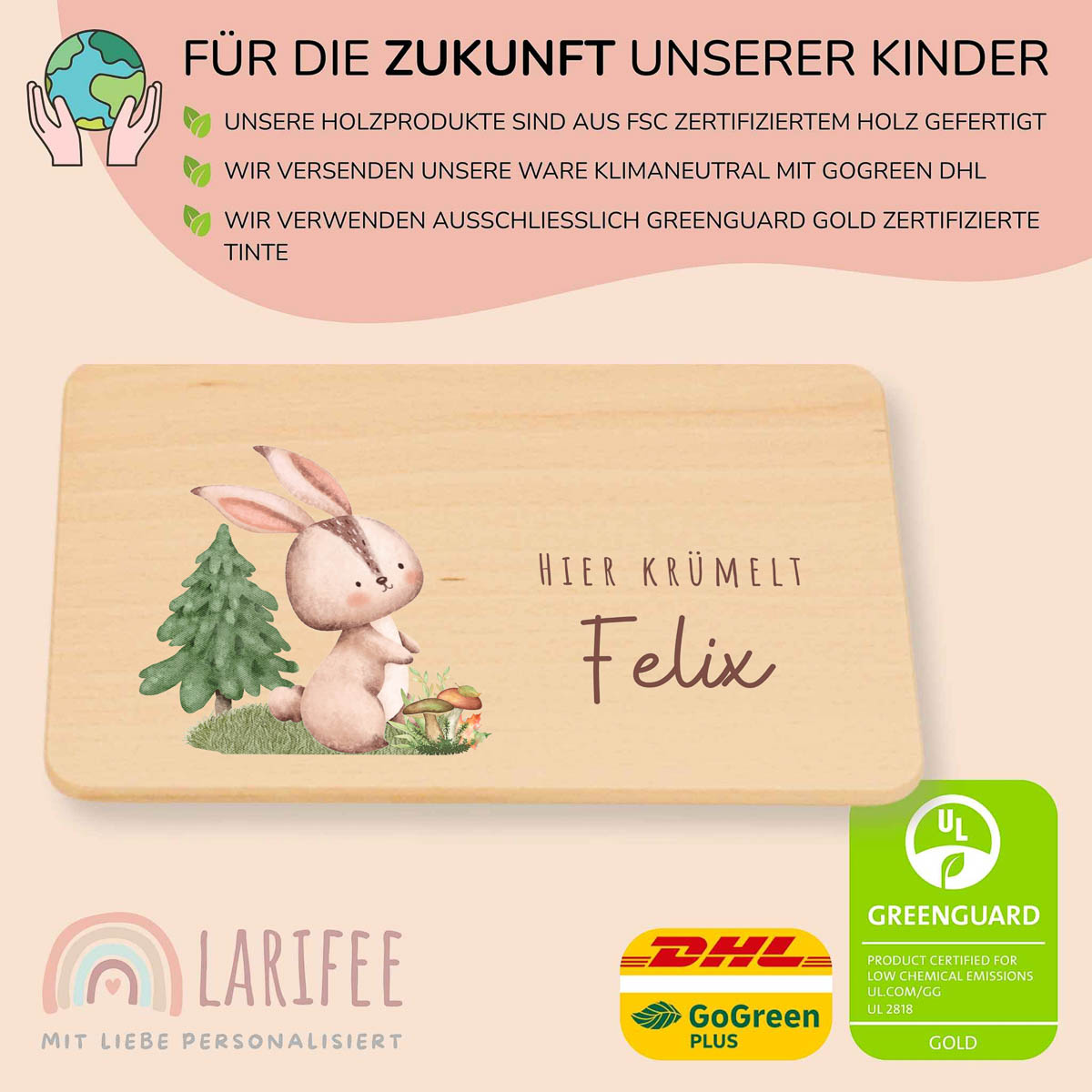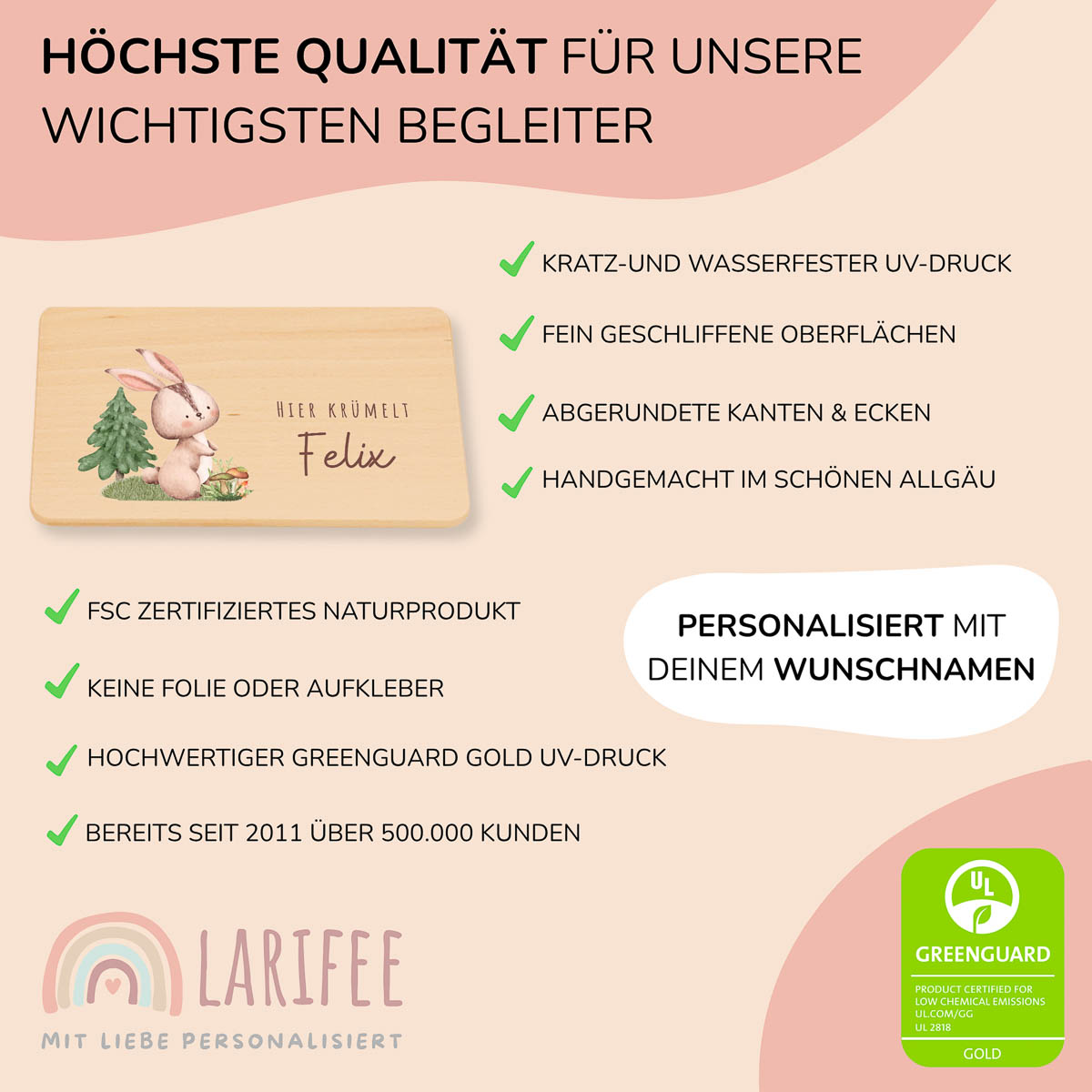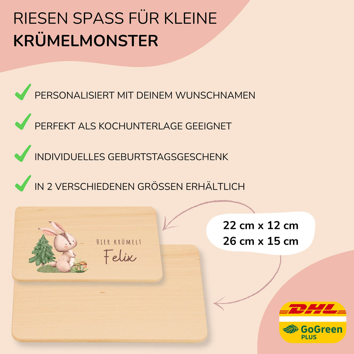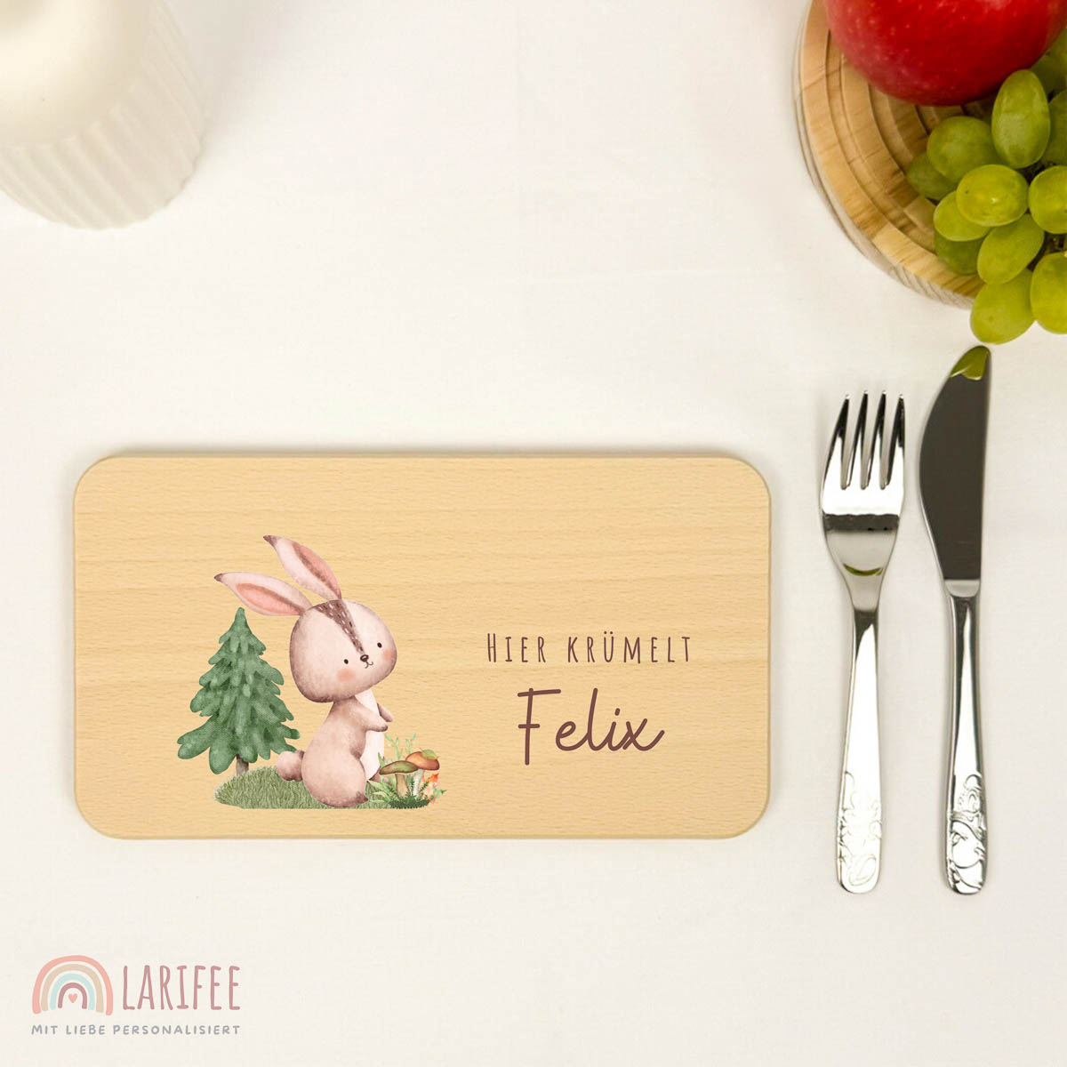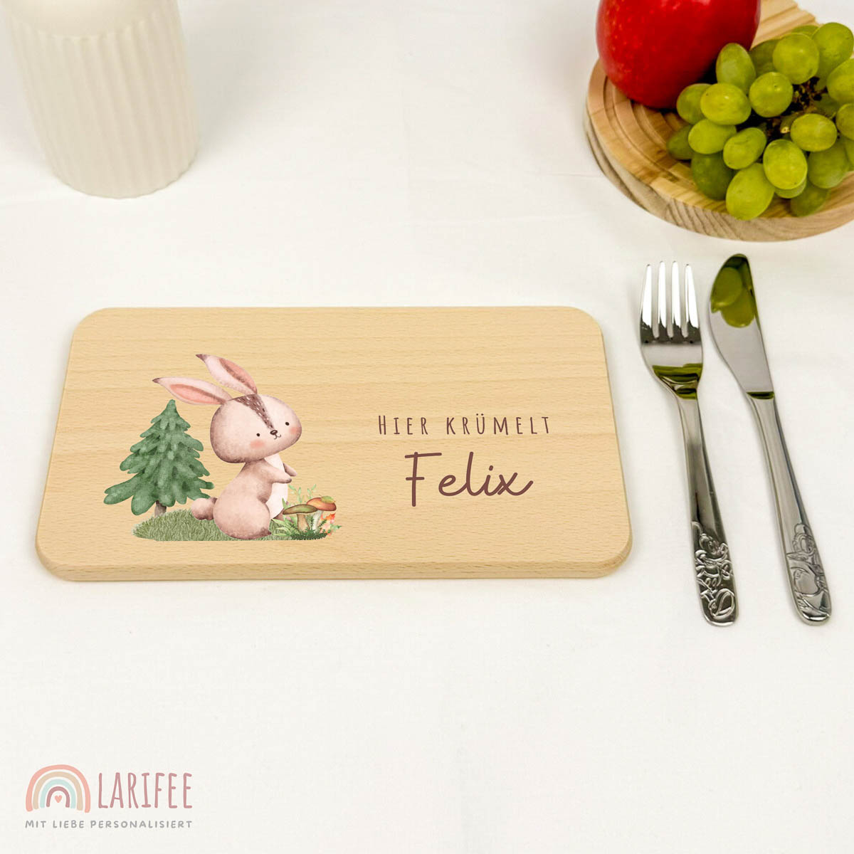 Das süße Hasen-Motiv verzaubert jeden Esstisch. Unser personalisiertes Frühstücksbrettchen aus Buchenholz ist umweltfreundlich bedruckt, kratzfest und wasserfest – ein tolles Geschenk für kleine Tierfreunde!