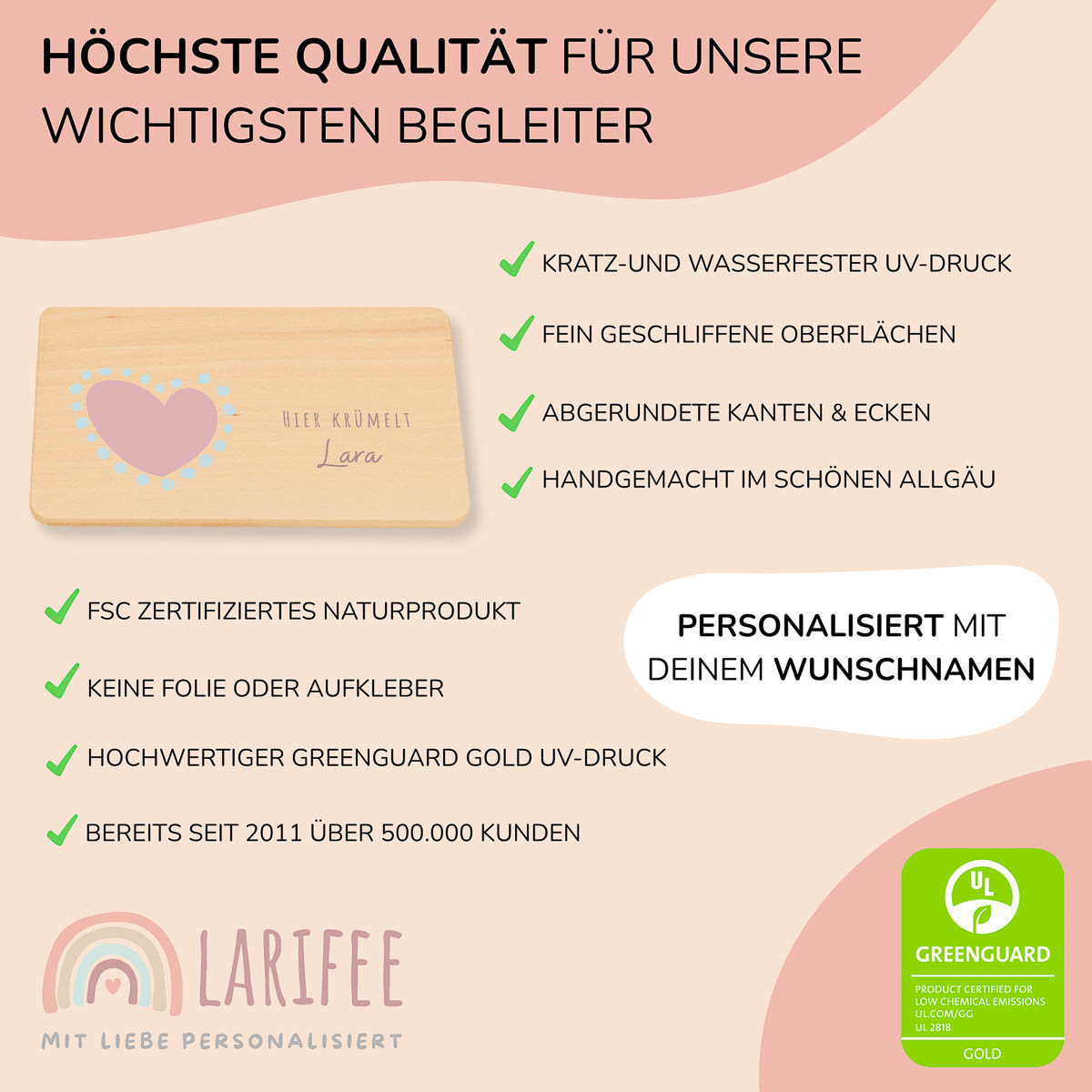 Ein schlichtes und elegantes Herz verleiht jeder Mahlzeit eine besondere Note. Unser personalisiertes Frühstücksbrettchen aus Buchenholz ist mit umweltfreundlicher Tinte bedruckt, kratzfest und wasserfest – perfekt als Geschenk!