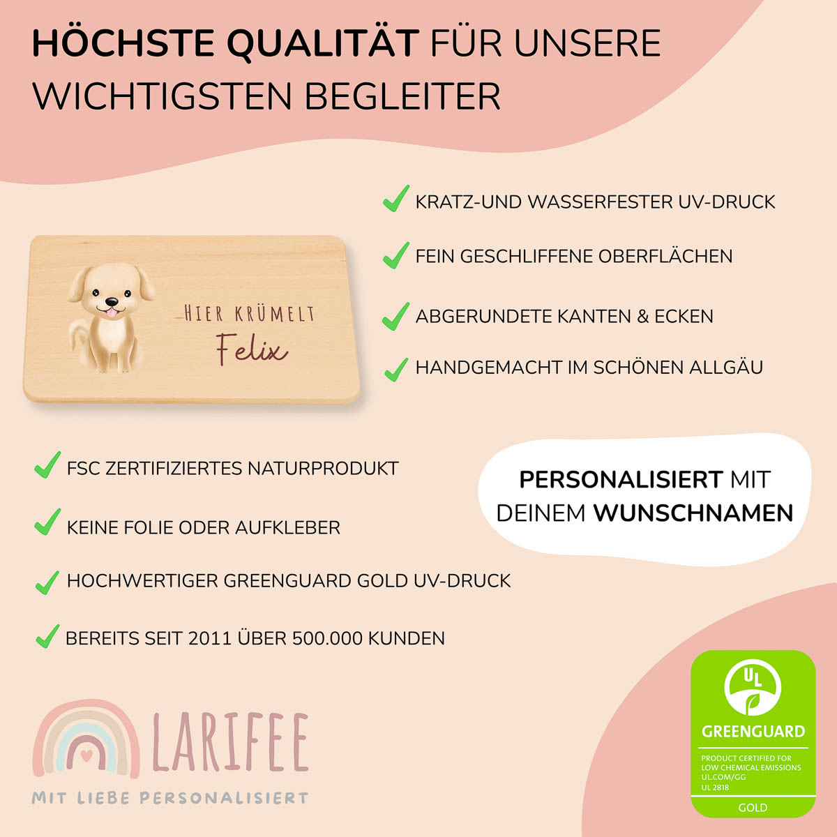 Das süße Hundemotiv bringt tierische Freude auf den Tisch – mit deinem Namen wird’s ganz persönlich. Gefertigt aus hochwertigem Buchenholz, bedruckt mit umweltfreundlicher Tinte, kratzfest und wasserfest – ein treuer Begleiter bei jeder Mahlzeit!