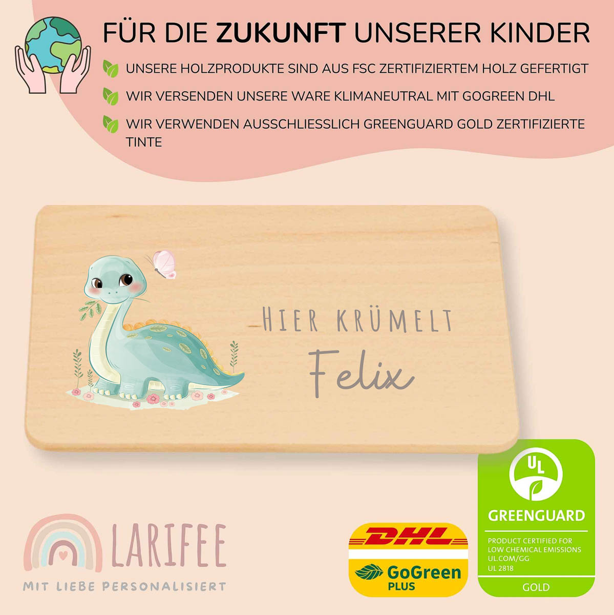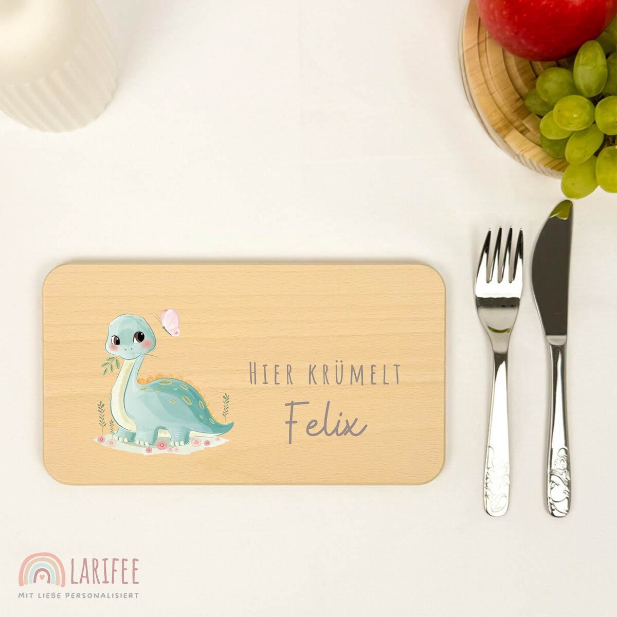 Frühstücksbrettchen Holz personalisiert – Langhals Dino