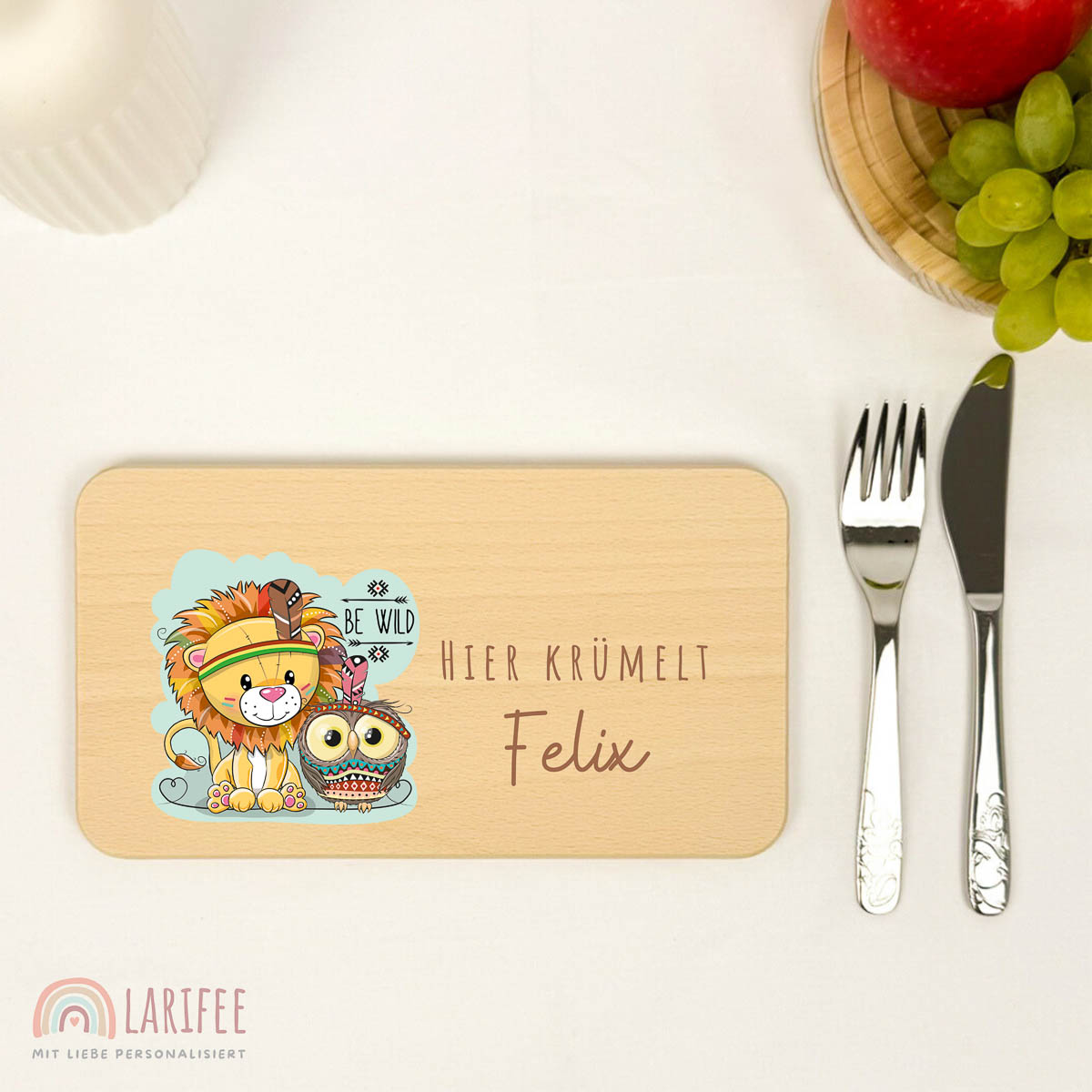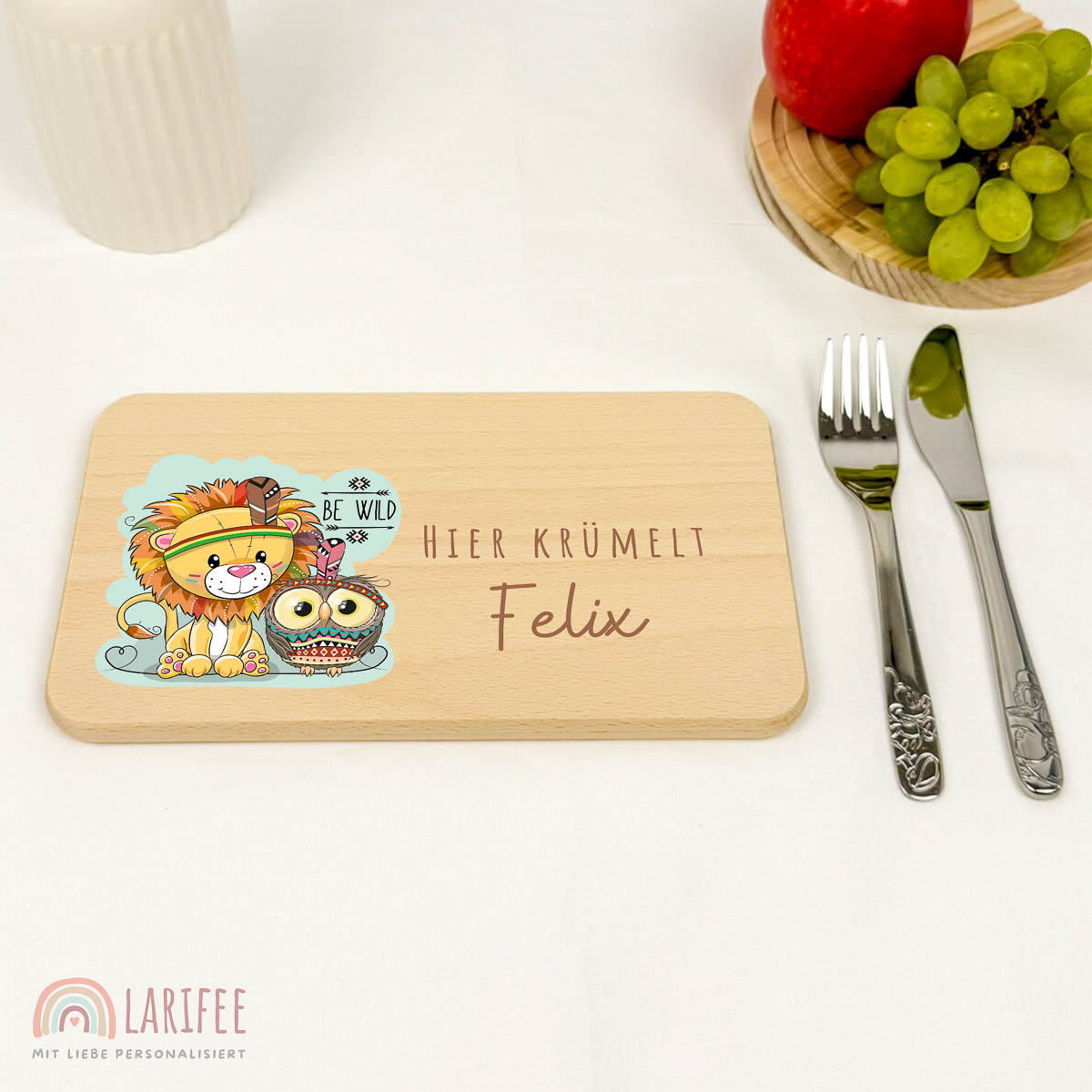 Frühstücksbrettchen Holz personalisiert – Löwe & Eule