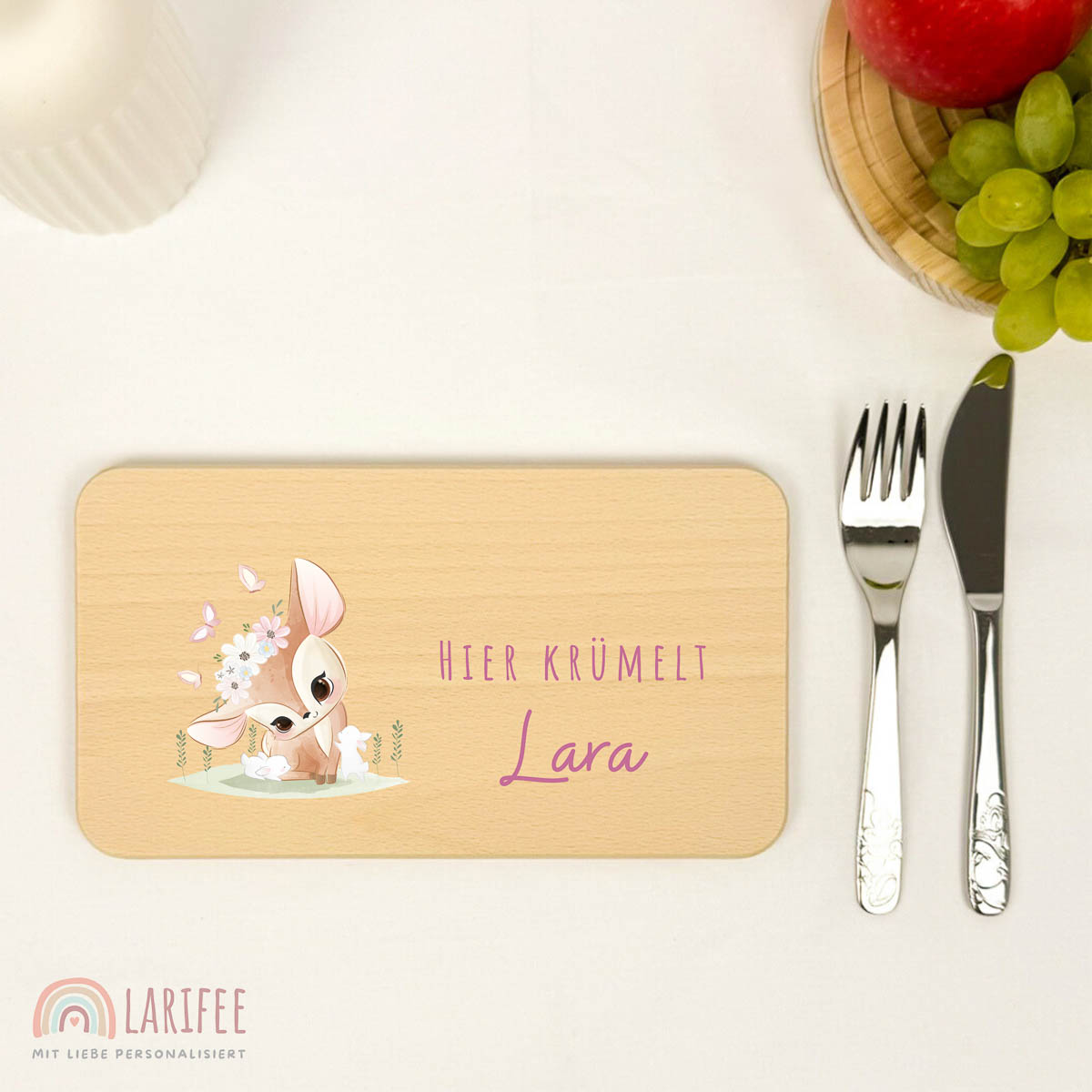 Das liebevolle Reh-Motiv macht dieses personalisierte Frühstücksbrettchen zu einem besonderen Begleiter. Aus hochwertigem Buchenholz gefertigt. Bedruckt mit umweltfreundlicher Tinte. Kratzfest und wasserfest.