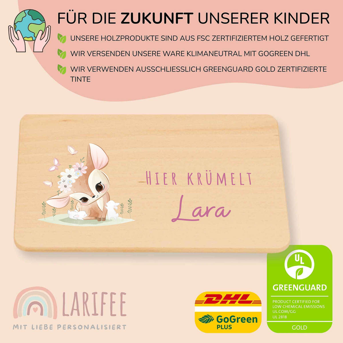 Für die Personalisierung nutzen wir keine Folie oder Aufkleber. Das Motiv wird mit einem speziellen UV-Druckverfahren direkt auf das Holz aufgebracht. Wir verwenden dabei umweltfreundliche, GREENGUARD Gold zertifizierte Tinte, die für Kinderspielzeug geeignet ist. Der Druck ist kratzfest und wasserfest, sodass das Motiv lange erhalten bleibt.