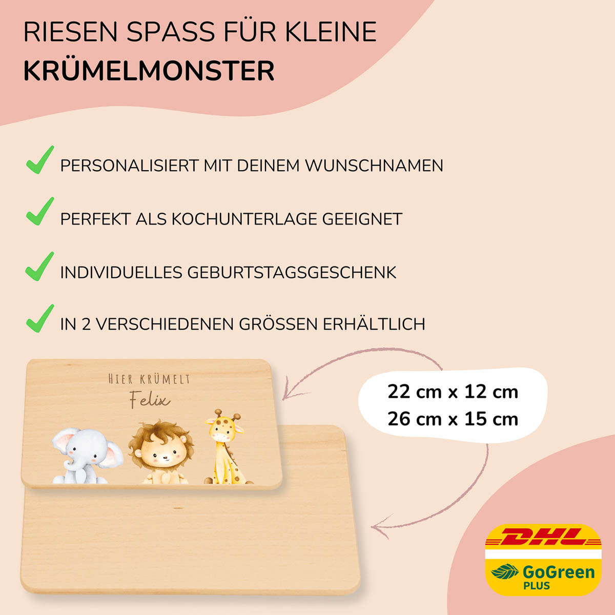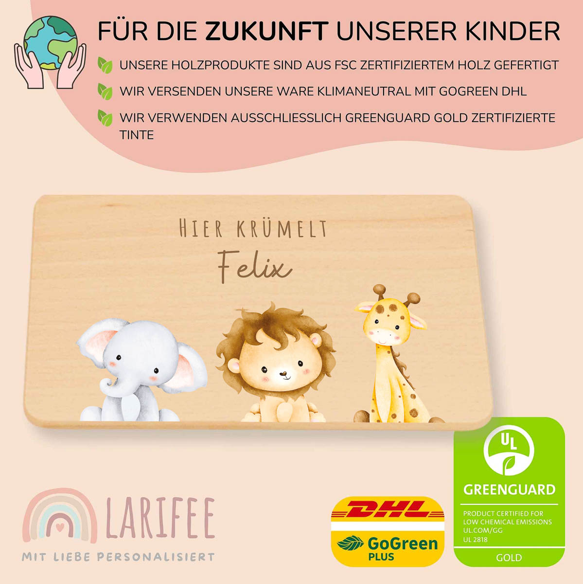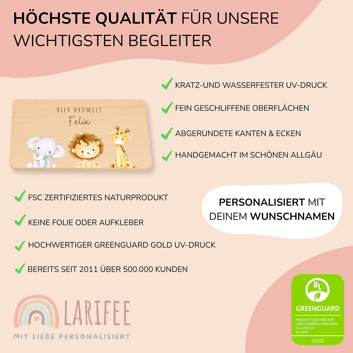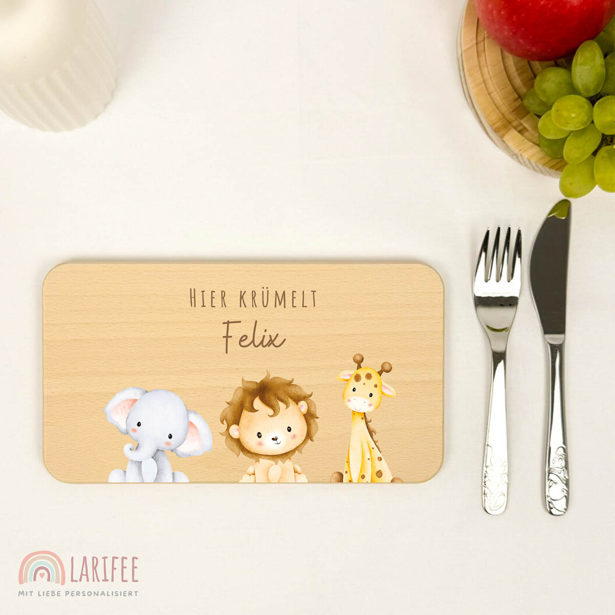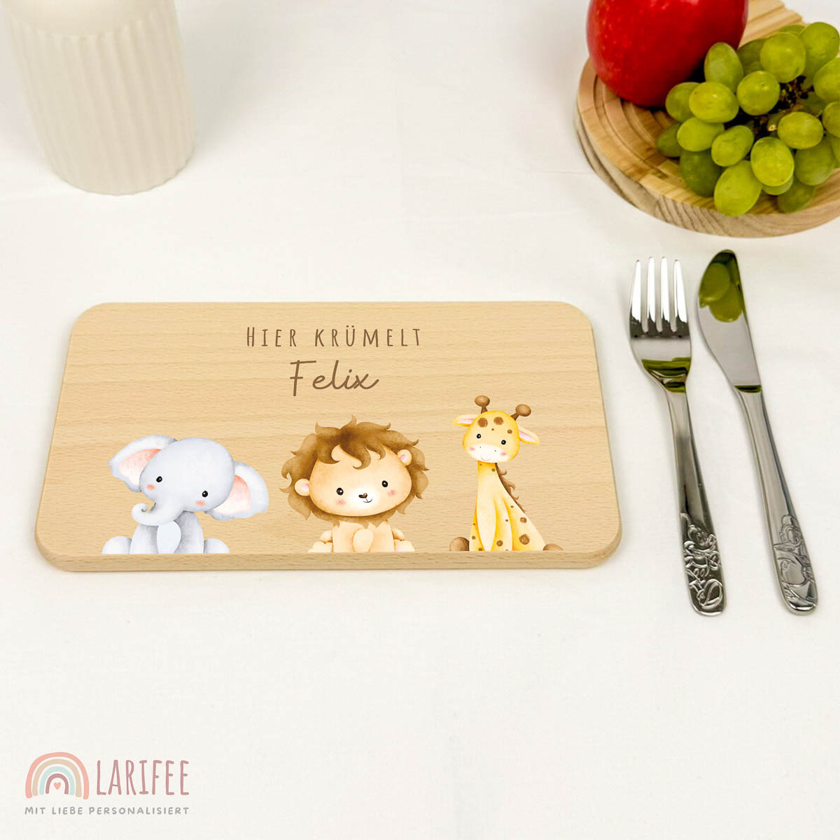 Unser personalisiertes Frühstücksbrettchen mit Safari Tieren begleitet dein Kind bei jeder Mahlzeit.