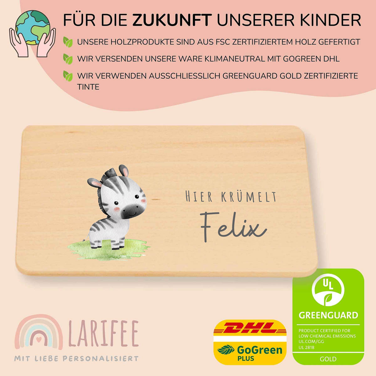 Für die Personalisierung nutzen wir keine Folie oder Aufkleber. Das Motiv wird mit einem speziellen UV-Druckverfahren direkt auf das Holz aufgebracht. Wir verwenden dabei umweltfreundliche, GREENGUARD Gold zertifizierte Tinte, die für Kinderspielzeug geeignet ist. Der Druck ist kratzfest und wasserfest, sodass das Motiv lange erhalten bleibt.