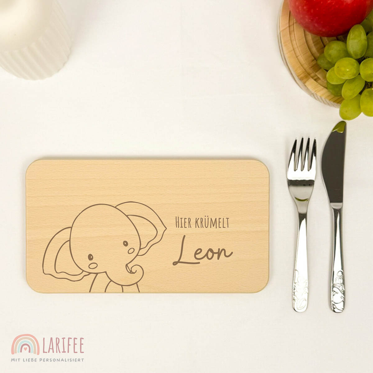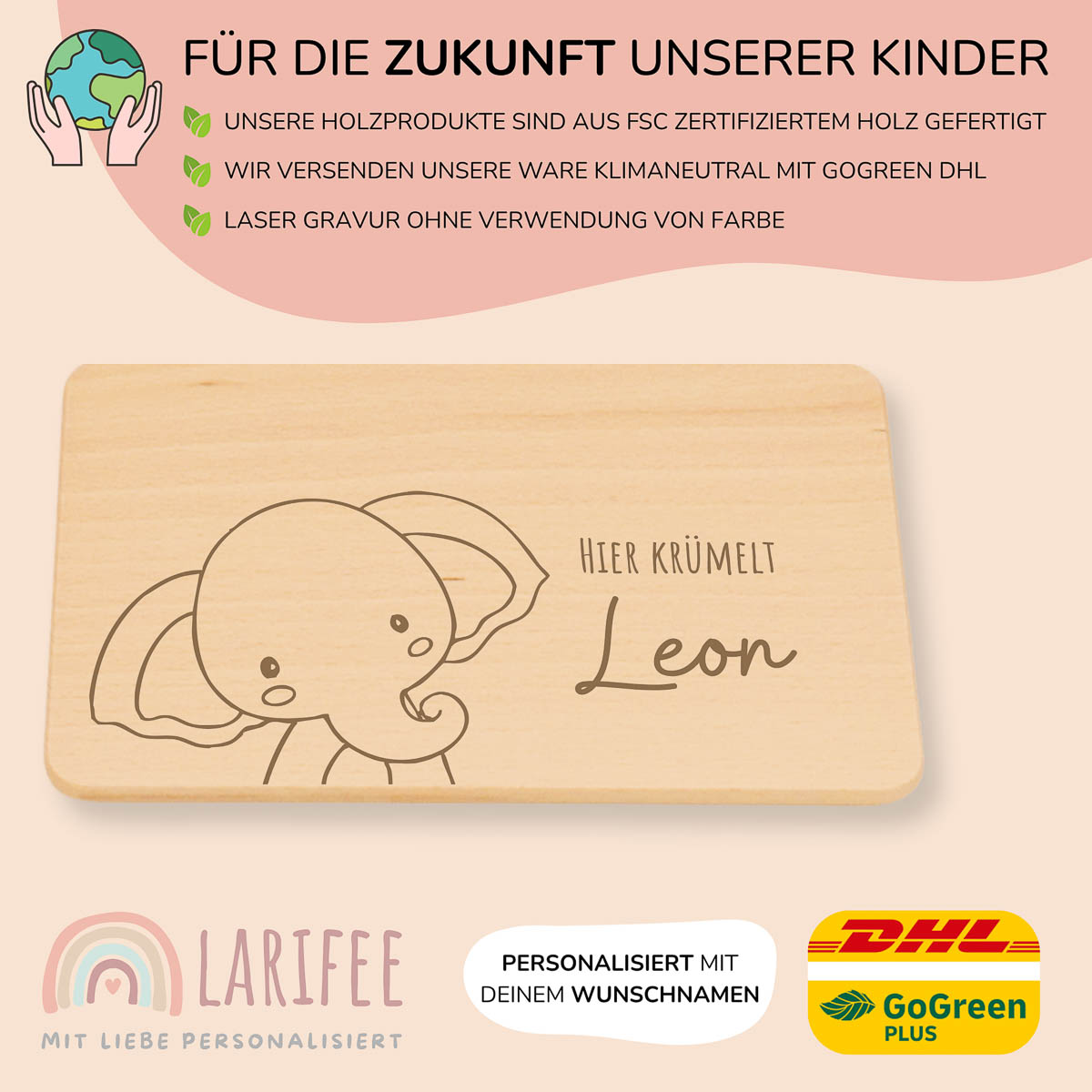 Unser personalisiertes Holzbrettchen mit starkem Elefanten begleitet dein Kind durch den Tag.