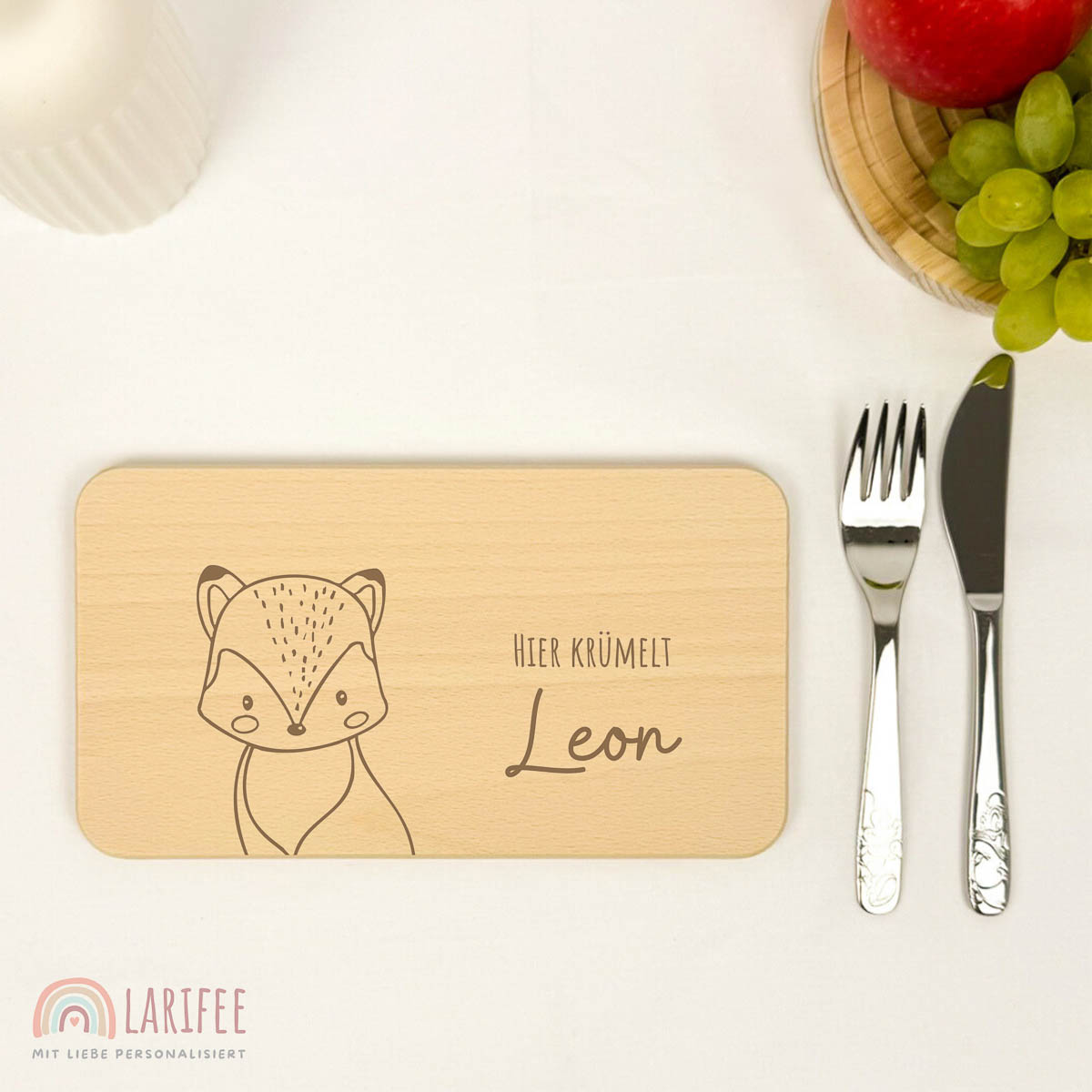 Unser personalisiertes Holzbrettchen mit schlauem Fuchs macht jede Brotzeit besonders.