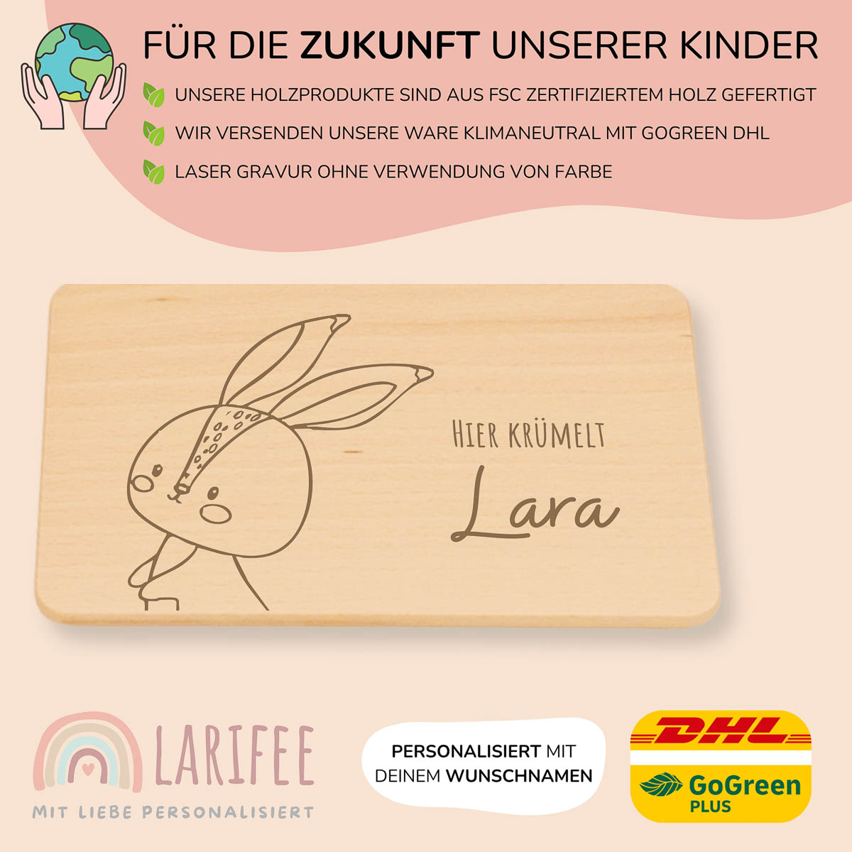 Ein süßer Hase ziert dieses hochwertige personalisierte Holzbrettchen. Mit langlebiger Gravur, kratzfester und wasserfester Oberfläche – perfekt für kleine Genießer.