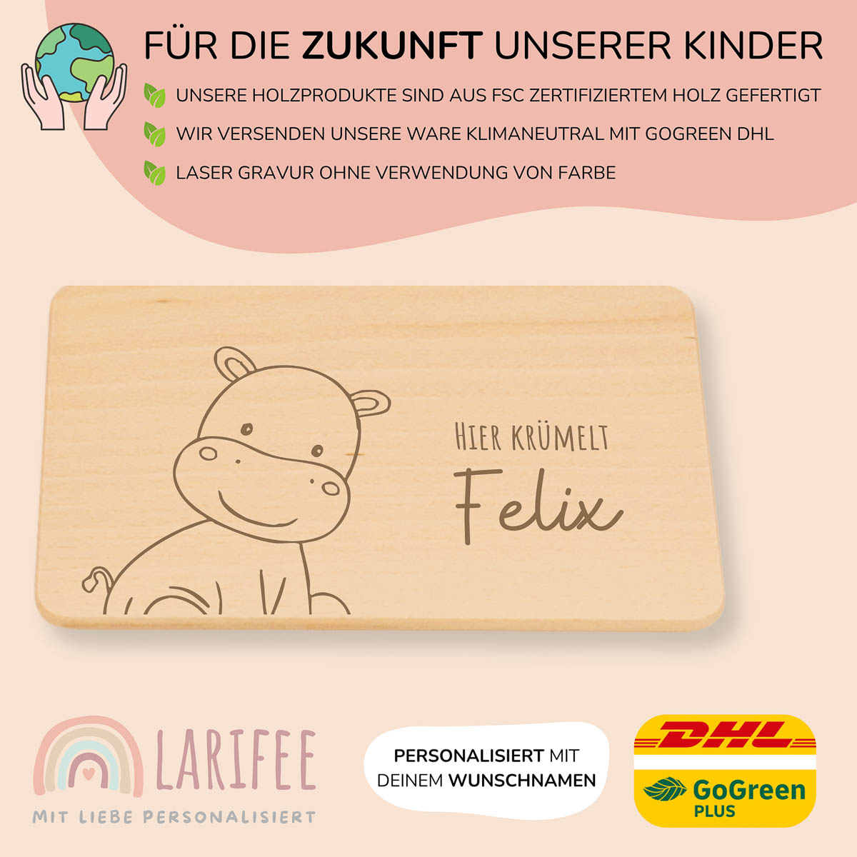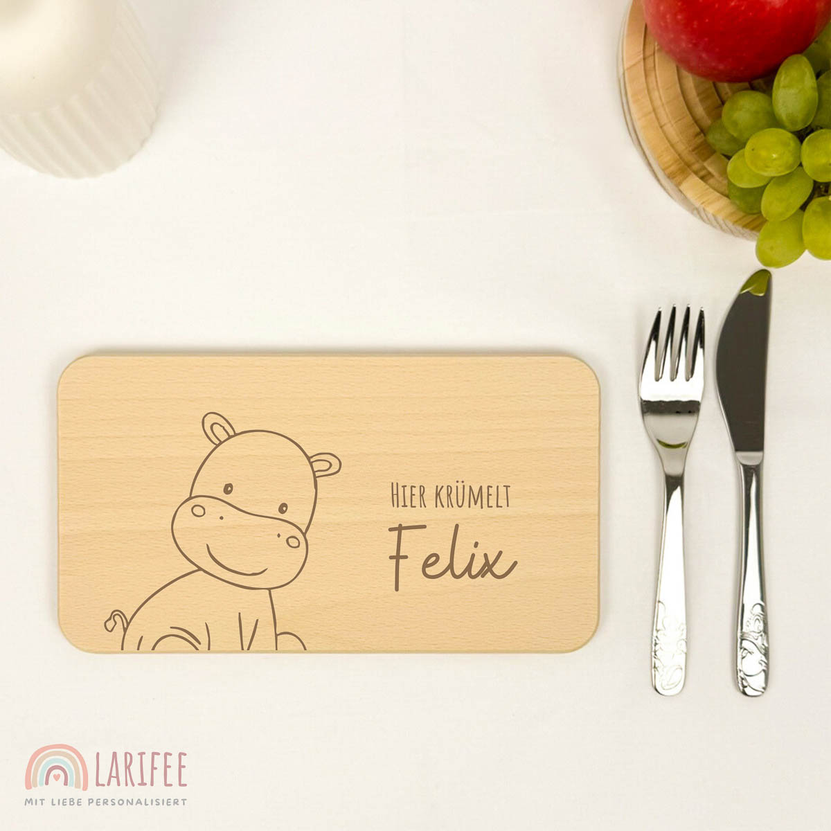 Unser personalisiertes Holzbrettchen mit fröhlichem Nilpferd bringt Lachen an den Frühstückstisch.