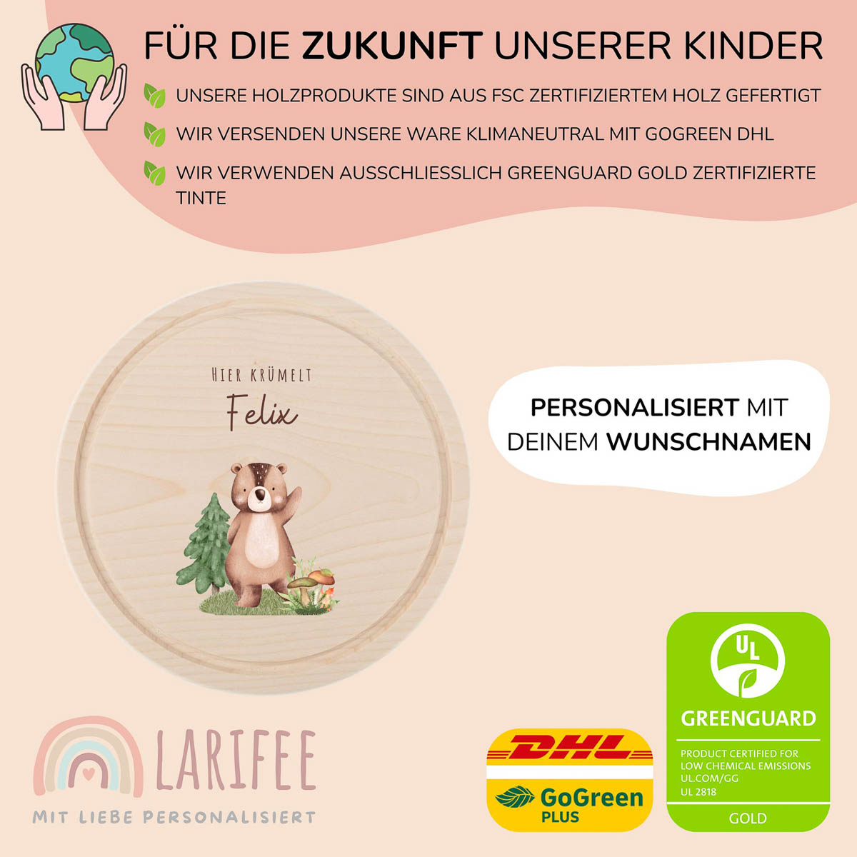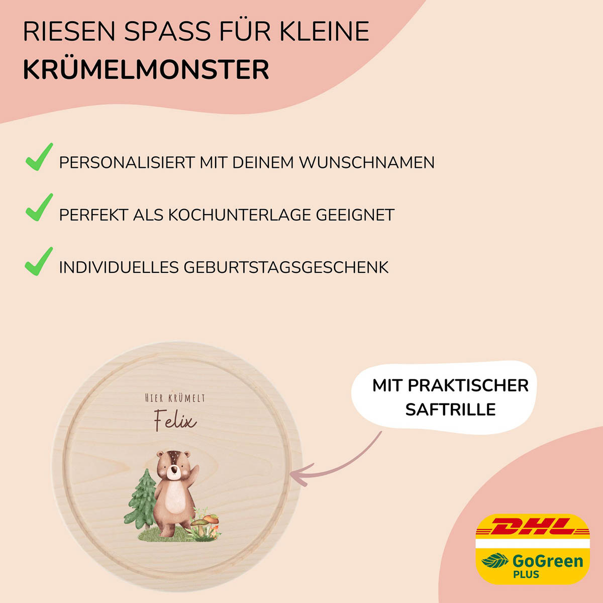 Der Bär begleitet kleine Genießer durch den Tag. Das runde Frühstücksbrettchen aus hochwertigem Ahornholz ist mit Namen personalisiert, bedruckt mit umweltfreundlicher Tinte und besonders robust – kratzfest und wasserfest.