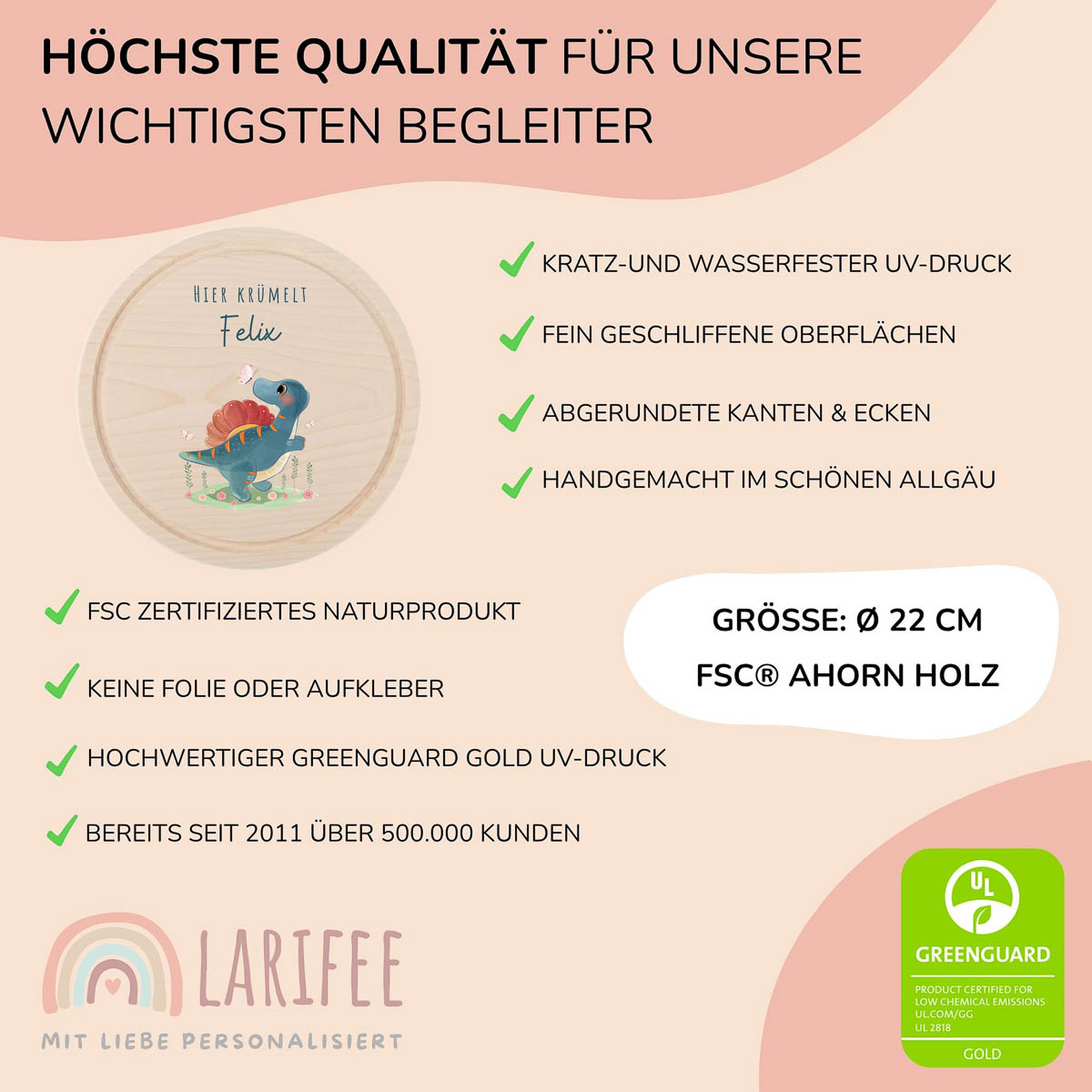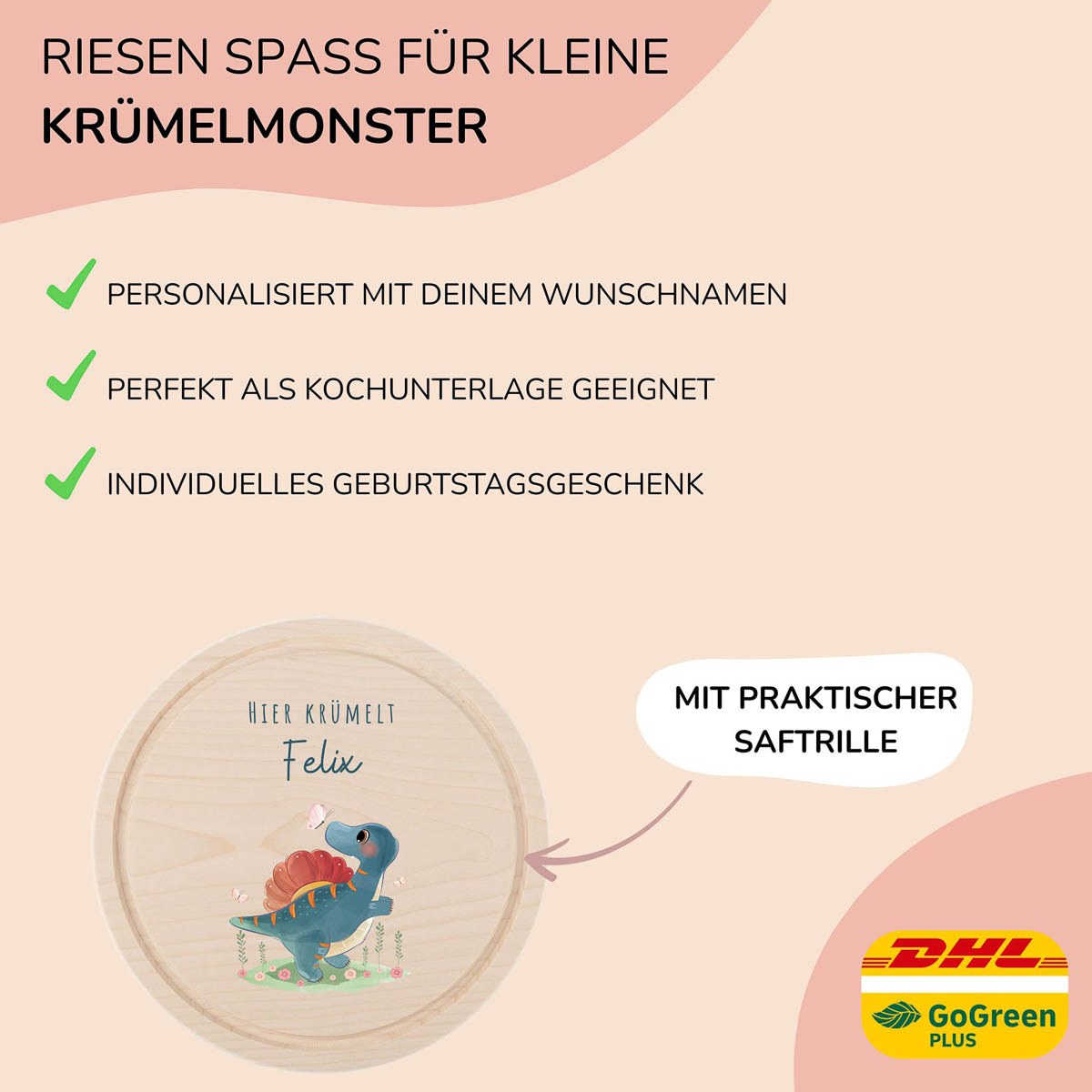 Ein neugieriger Dino begleitet kleine Abenteurer auf diesem runden, personalisierten Frühstücksbrettchen. Aus hochwertigem Ahornholz gefertigt, bedruckt mit umweltfreundlicher Tinte. Kratzfest und wasserfest – für viele bunte Mahlzeiten.