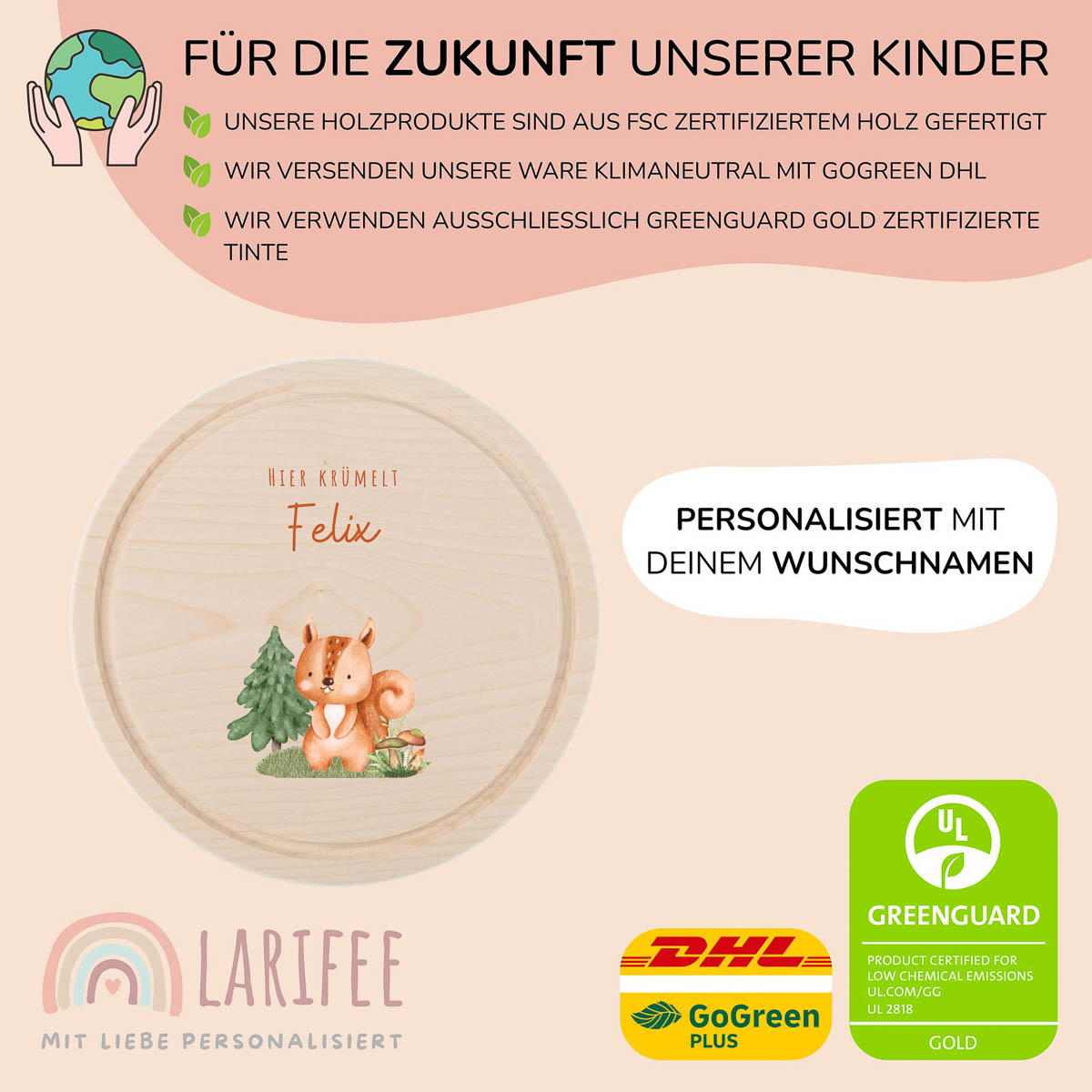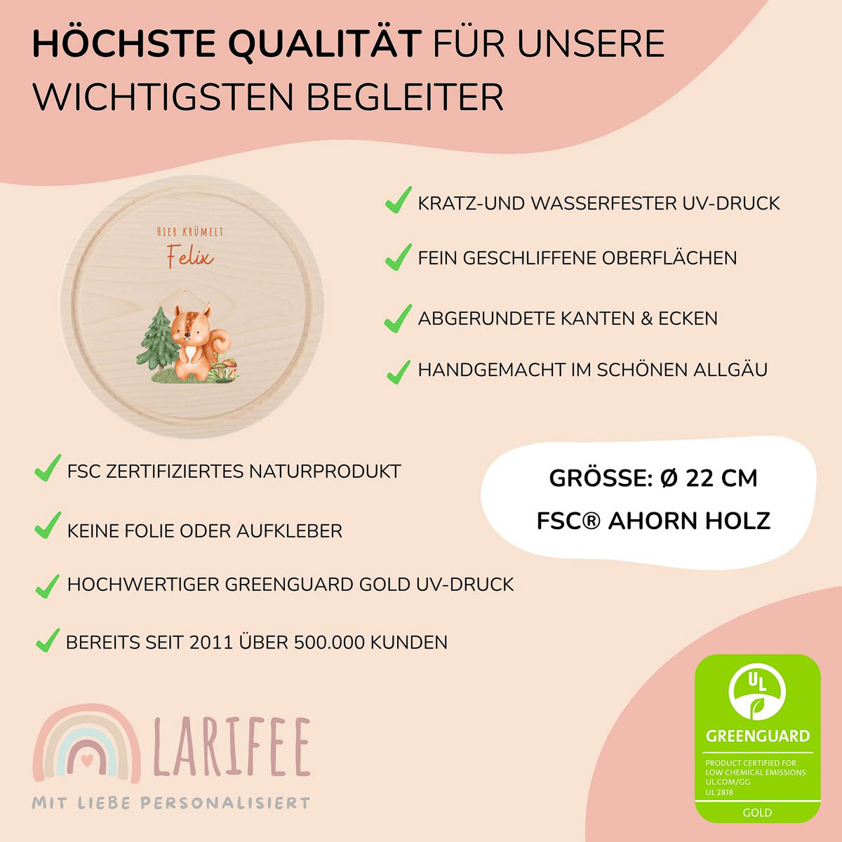 Das verspielte Eichhörnchen bringt Energie auf den Tisch. Das personalisierte Ahornholzbrett ist rund, kratzfest und wasserfest. Perfekt für die tägliche Brotzeit.
