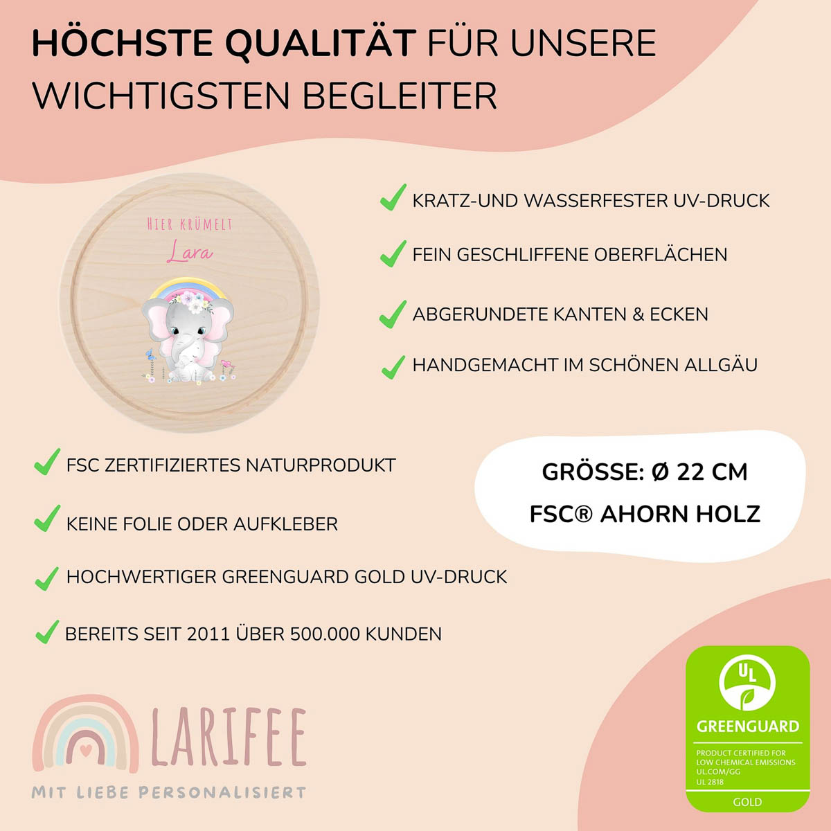 Zwei sanfte Elefanten zieren dieses runde Frühstücksbrettchen, das mit Wunschname personalisiert wird. Aus hochwertigem Ahornholz gefertigt und mit umweltfreundlicher Tinte bedruckt. Die Oberfläche ist kratzfest und wasserfest – für liebevolle Mahlzeiten.