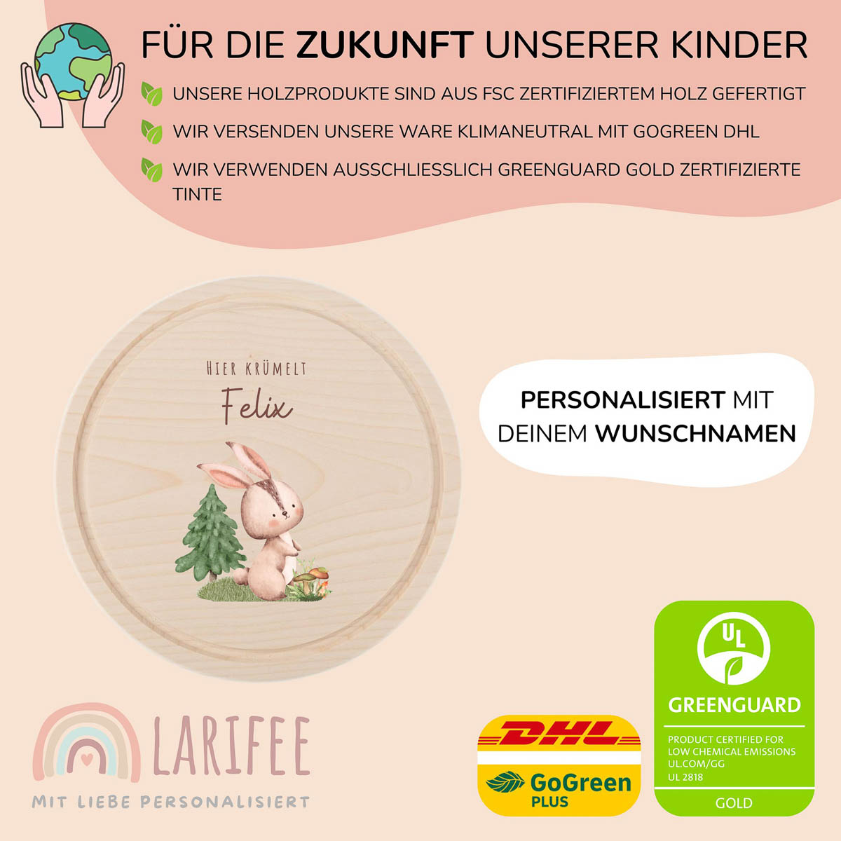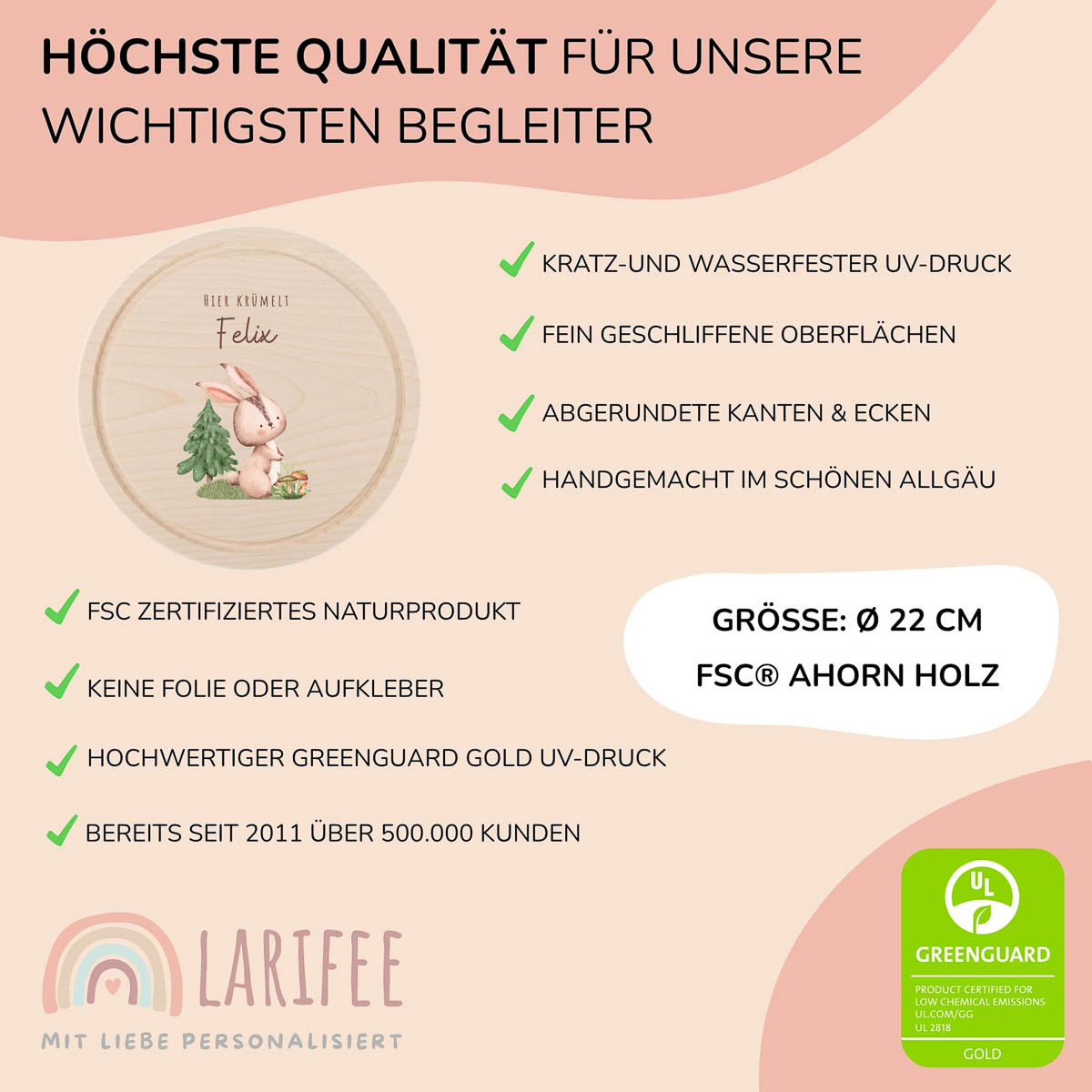 Für die Personalisierung nutzen wir keine Folie oder Aufkleber. Das Motiv wird mit einem speziellen UV-Druckverfahren direkt auf das Holz aufgebracht. Wir verwenden dabei umweltfreundliche, GREENGUARD Gold zertifizierte Tinte, die für Kinderspielzeug geeignet ist. Der Druck ist kratzfest und wasserfest, sodass das Motiv lange erhalten bleibt.