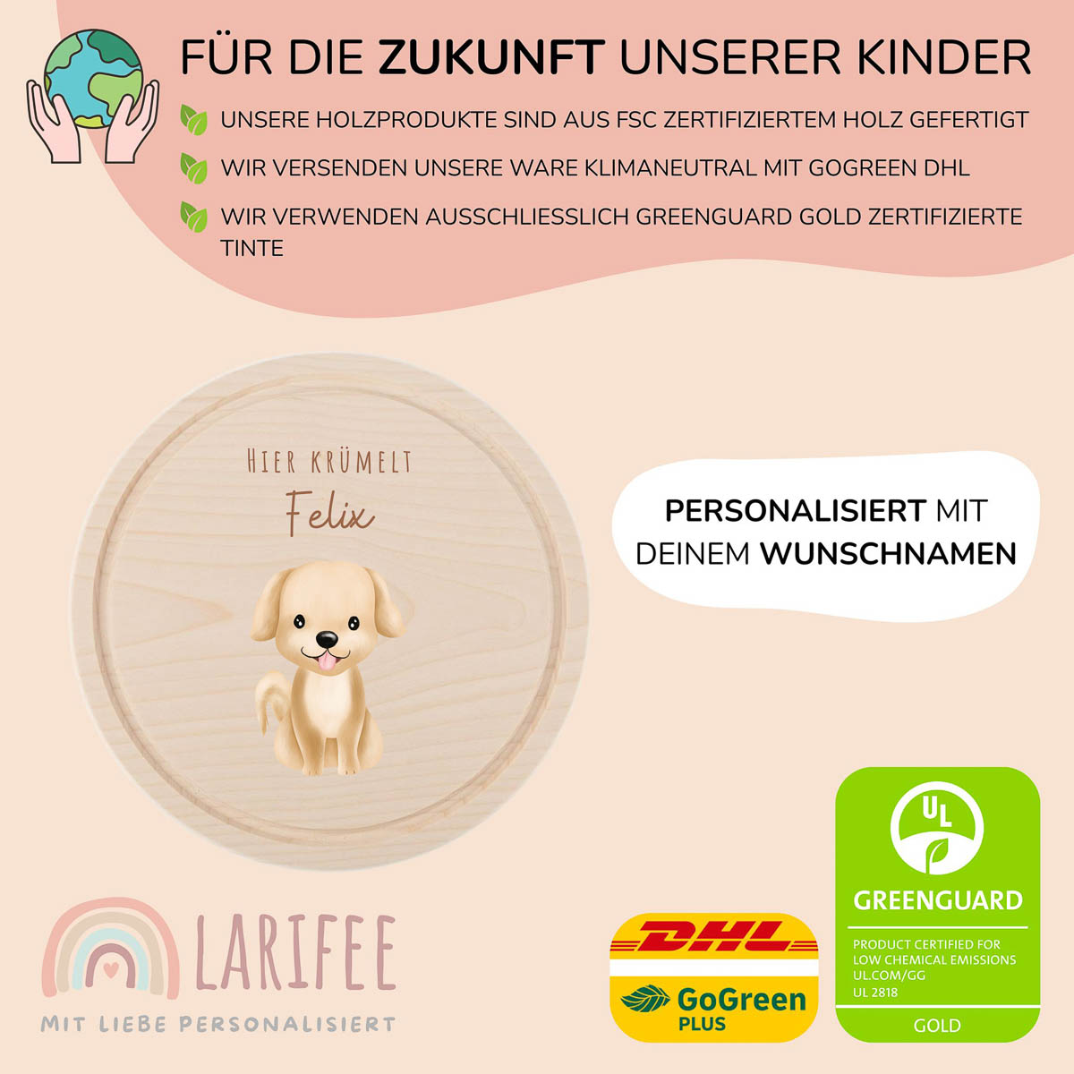 Ein treuer Hund bringt Leben auf das runde, personalisierte Frühstücksbrettchen aus Ahornholz. Bedruckt mit umweltfreundlicher Tinte, kratzfest und wasserfest – ein fröhlicher Begleiter bei jeder Mahlzeit.