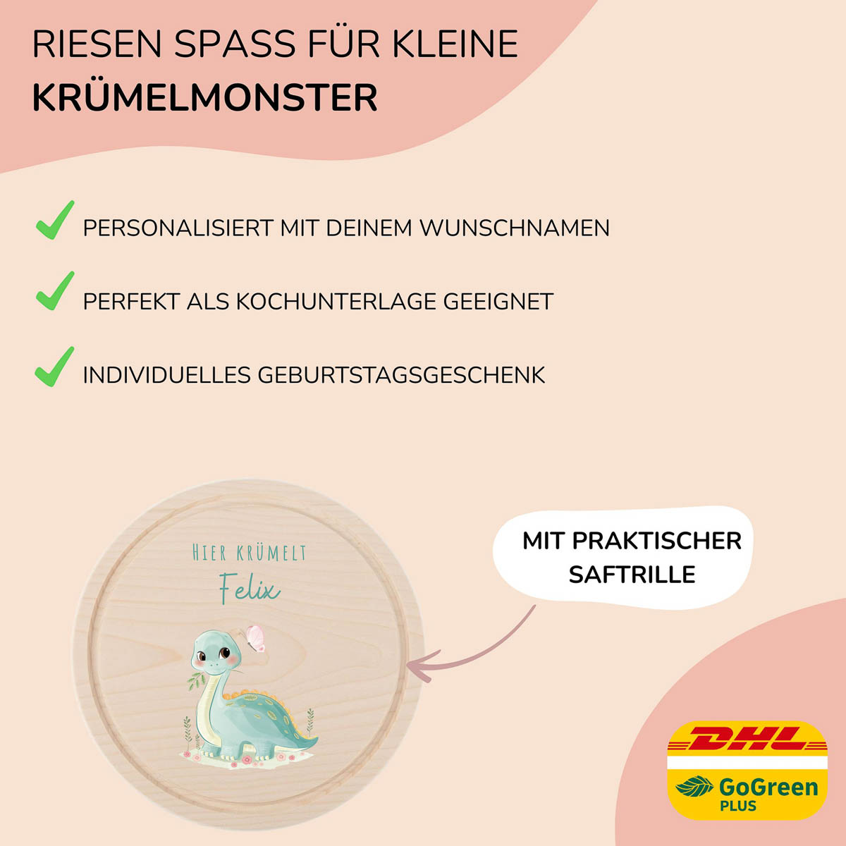 Dieses runde Frühstücksbrettchen mit Dino wird durch die Personalisierung zum echten Lieblingsstück. Gefertigt aus hochwertigem Ahornholz, bedruckt mit umweltfreundlicher Tinte. Die kratzfeste und wasserfeste Oberfläche macht es alltagstauglich.