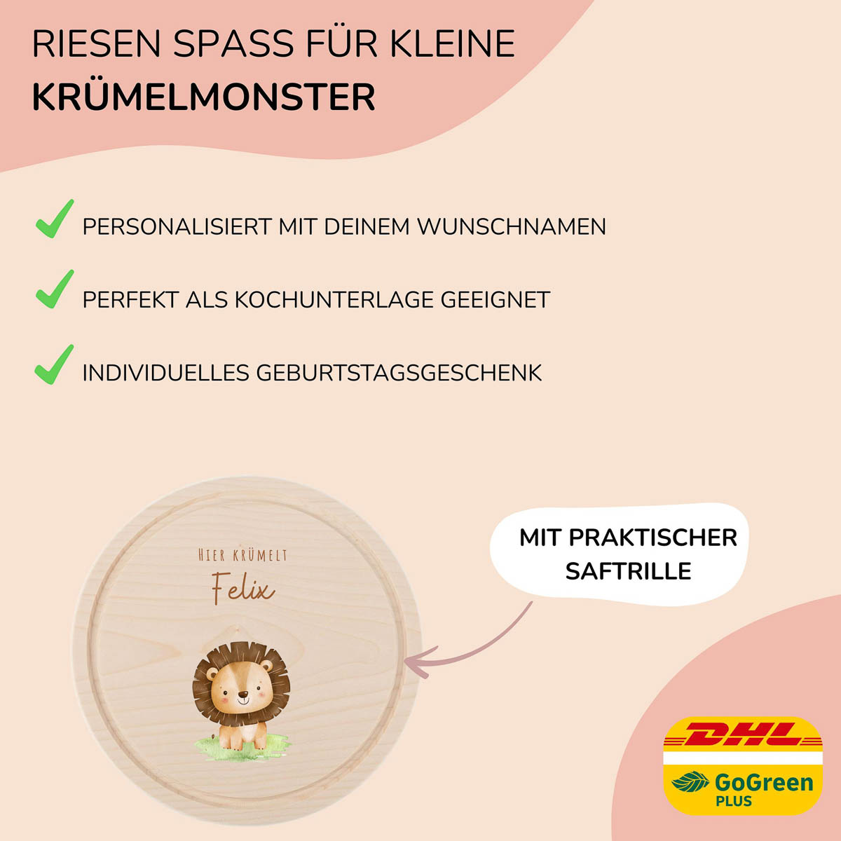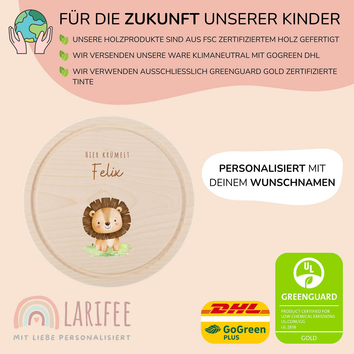 Der Löwe als König der Tiere macht das Essen zum Erlebnis. Das runde Frühstücksbrettchen aus hochwertigem Ahornholz ist mit Namen personalisiert, bedruckt mit umweltfreundlicher Tinte, kratzfest und wasserfest.