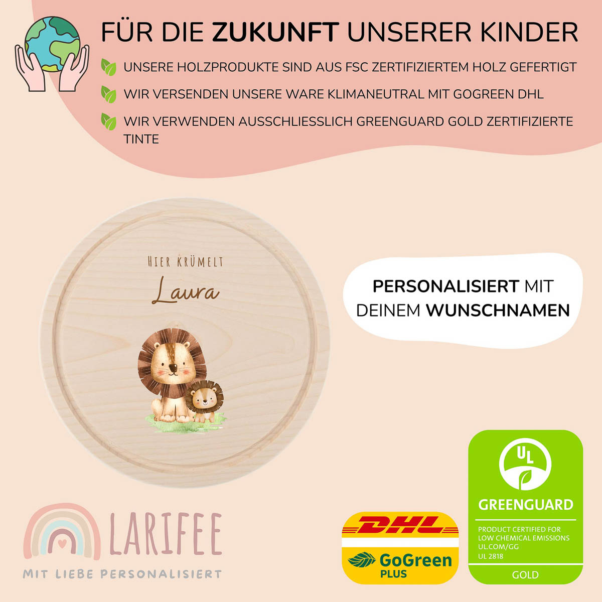 Frühstücksbrettchen Holz rund personalisiert – Löwen