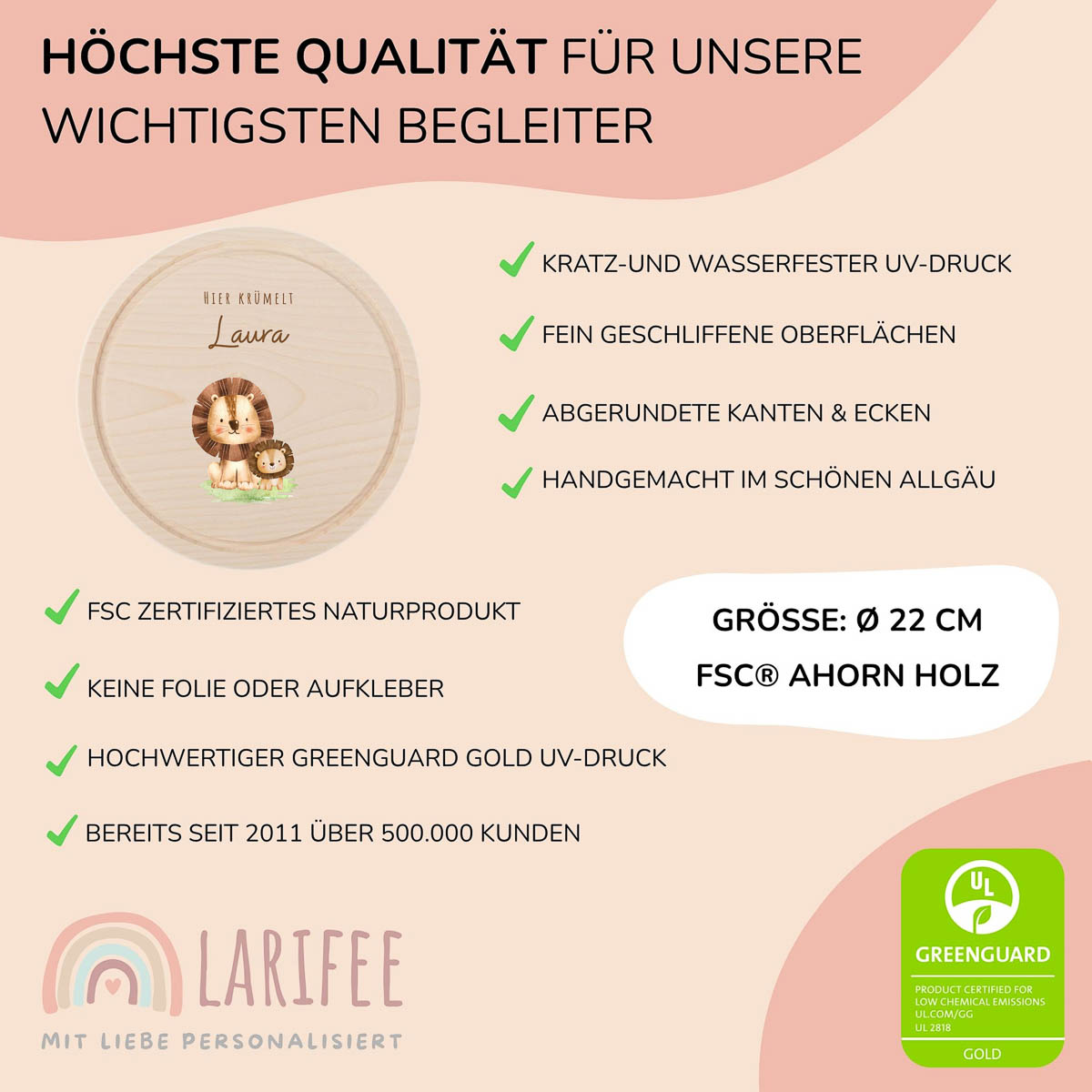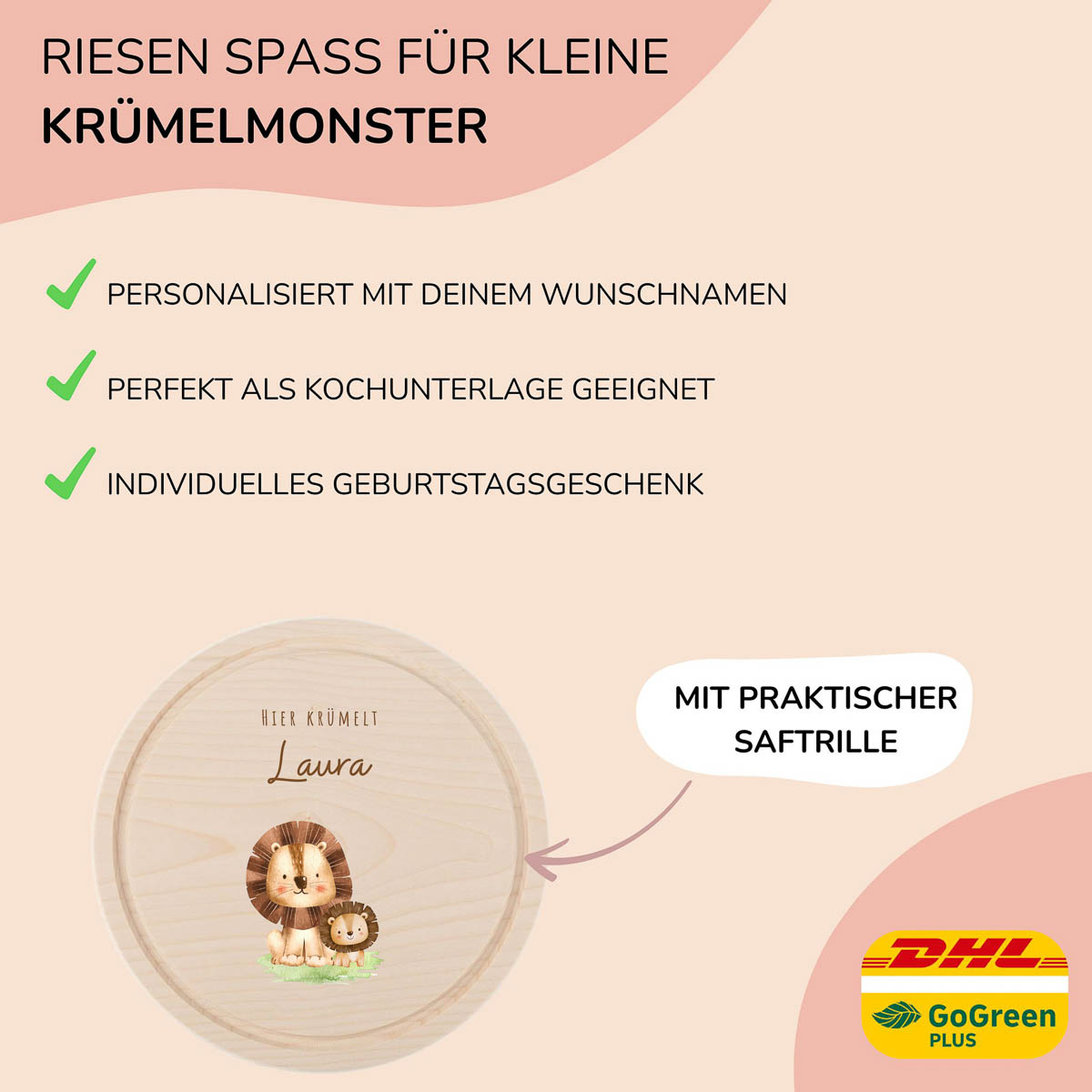 Die Löwen sorgen für Mut und gute Laune bei jeder Mahlzeit. Das runde Brettchen aus Ahornholz ist mit Namen personalisiert und hält durch die kratzfeste und wasserfeste Oberfläche viel aus.