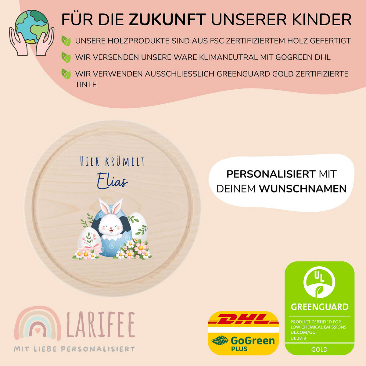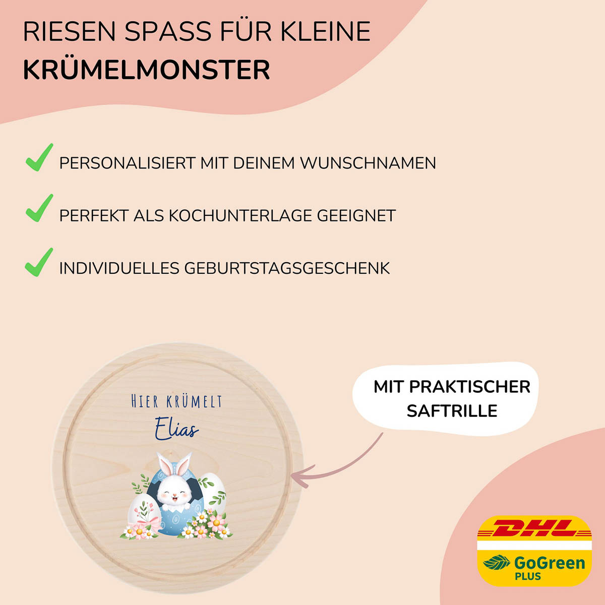 Ein liebevoll gestalteter Hase bringt österliche Freude an den Tisch. Das runde, personalisierte Frühstücksbrettchen aus hochwertigem Ahornholz ist mit umweltfreundlicher Tinte bedruckt, kratzfest und wasserfest. Ideal als kleine Aufmerksamkeit im Osternest.