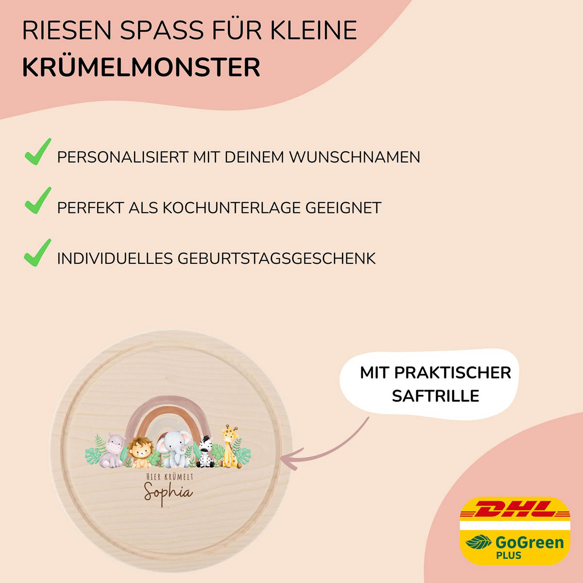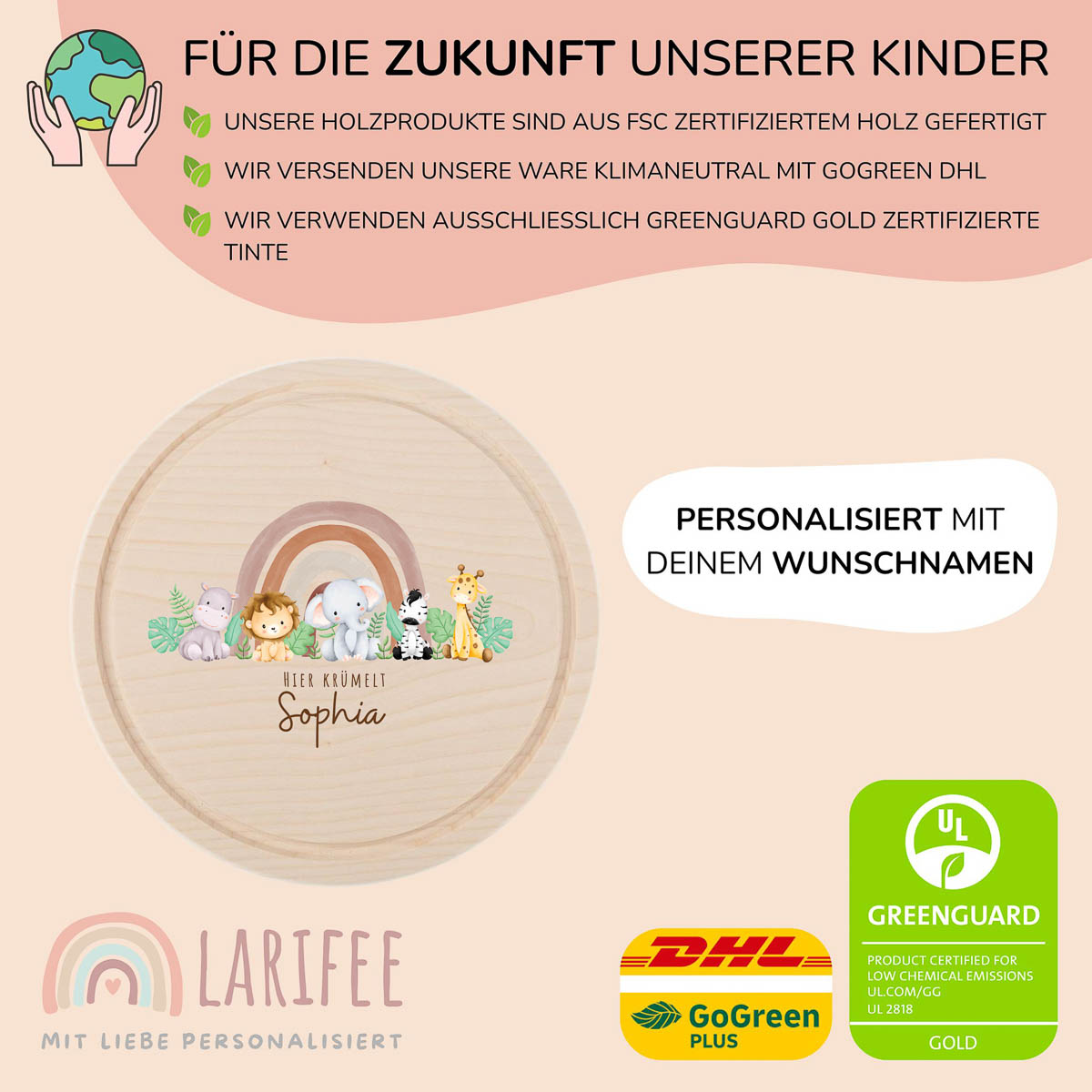Ein ganzer Safari-Trupp begleitet dein Kind durch die Mahlzeiten. Löwe, Giraffe, Zebra & Co. strahlen auf dem runden Brett aus Ahornholz. Umweltfreundlich bedruckt, robust und mit Namen personalisierbar.
