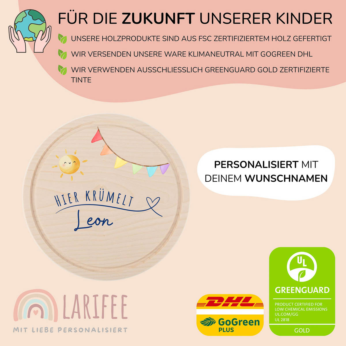 Mit der Sonne startet der Tag besonders freundlich. Das runde, personalisierte Frühstücksbrettchen aus hochwertigem Ahornholz ist mit umweltfreundlicher Tinte bedruckt, kratzfest und wasserfest.